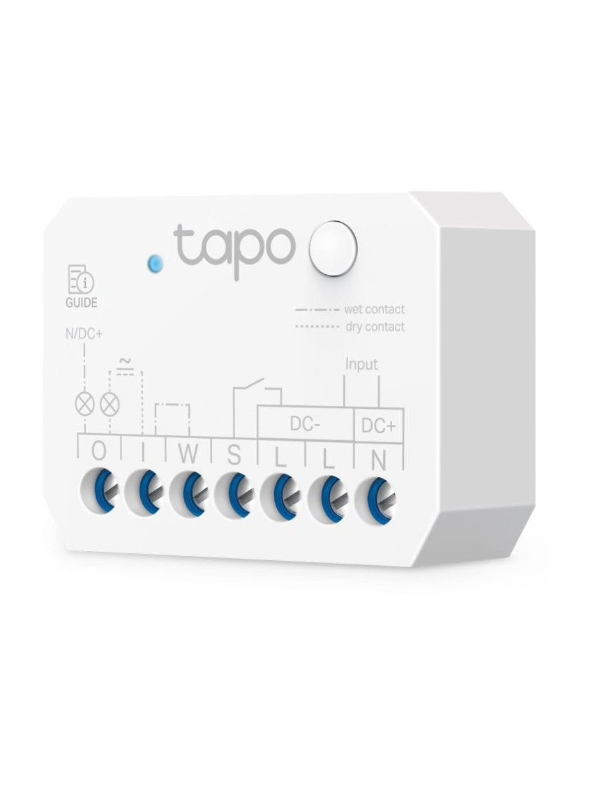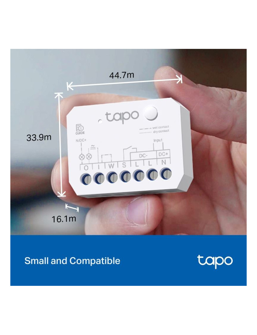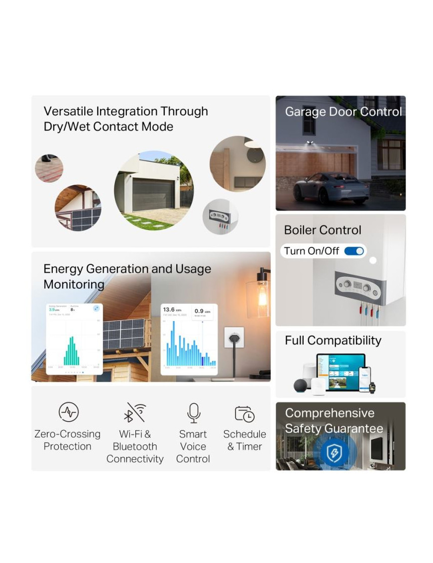 Tapo S110E: Inteligentný spínací modul s Matter - Kompaktný Wi-Fi/Bluetooth modul (44.7x33.9x16.1 mm) pre inteligentné ovládanie. Podporuje duálny režim: bezpotenciálový (suchý kontakt, 5-30V/10A) pre riadiace systémy (brány, kotly) a potenciálový (mokrý kontakt, 100-250V~/10A) pre svetlá a zásuvky. Disponuje hardvérovým obojsmerným meraním energie pre sledovanie spotreby aj výroby (napr. z FV). Certifikácia Matter zaisťuje plnú interoperabilitu (Apple Home, Alexa, Google). Obsahuje ochranu proti prechodu nulou pre dlhšiu životnosť relé. Inštalácia do EU krabíc.