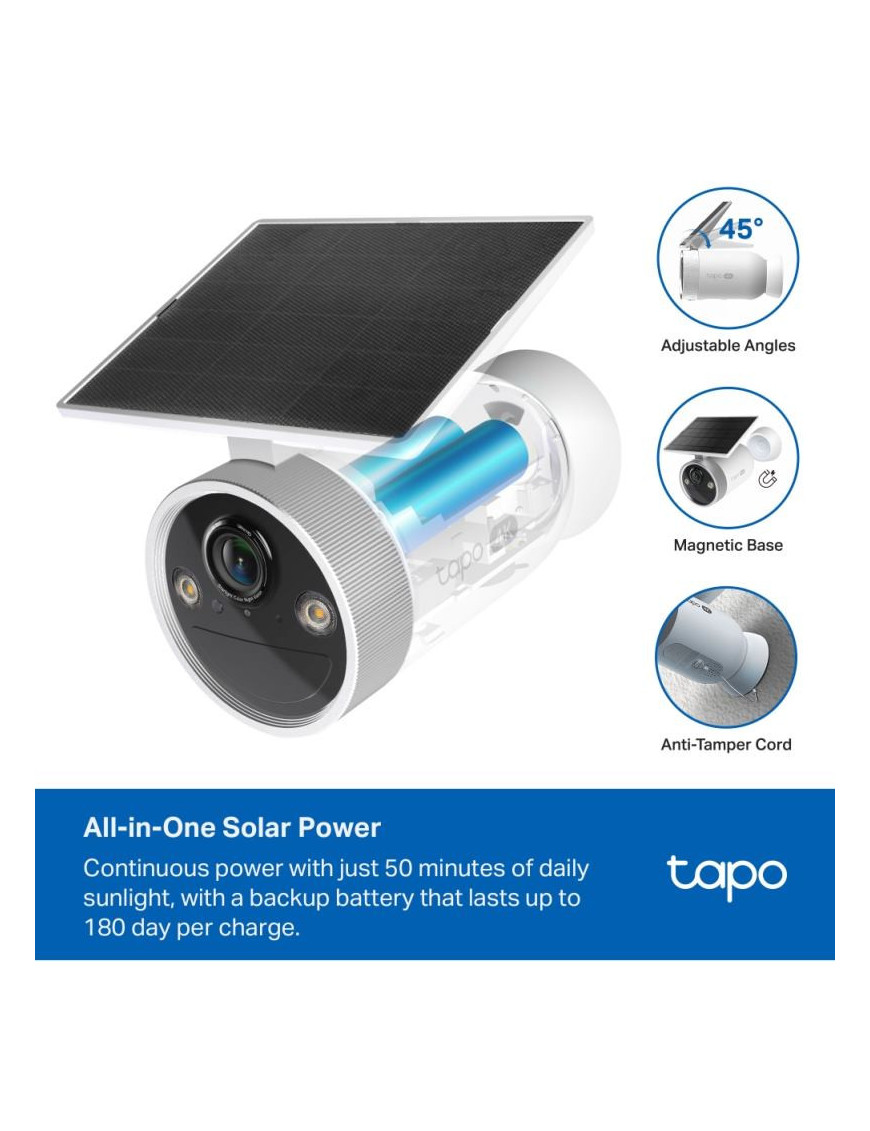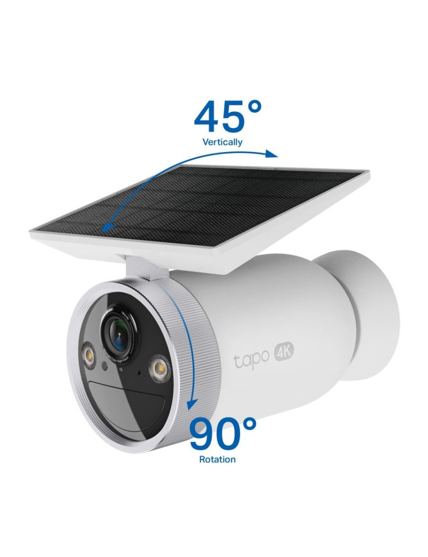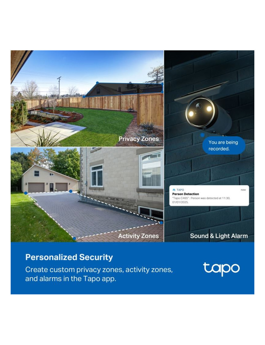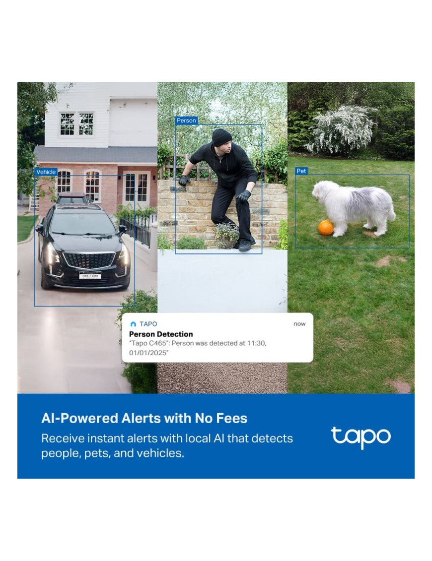Tapo C465 je bezpečnostná kamera s 4K UHD rozlíšením a solárnym panelom, vďaka ktorému je takmer sebestačná. Získate krištáľovo čistý obraz s detailmi, ktoré vám neuniknú. Inštalácia je jednoduchá vďaka magnetickej základni. Batéria vydrží až 180 dní. Kamera detekuje osoby, zvieratá a vozidlá pomocou AI bez mesačných poplatkov. Má odolnosť IP65, takže ju nezaskočí dážď ani sneh. Pripojenie cez 2.4 GHz alebo 5 GHz Wi-Fi. Môžete si nastaviť vlastné alarmy, zóny a súkromie. Záznam si uložíte lokáln