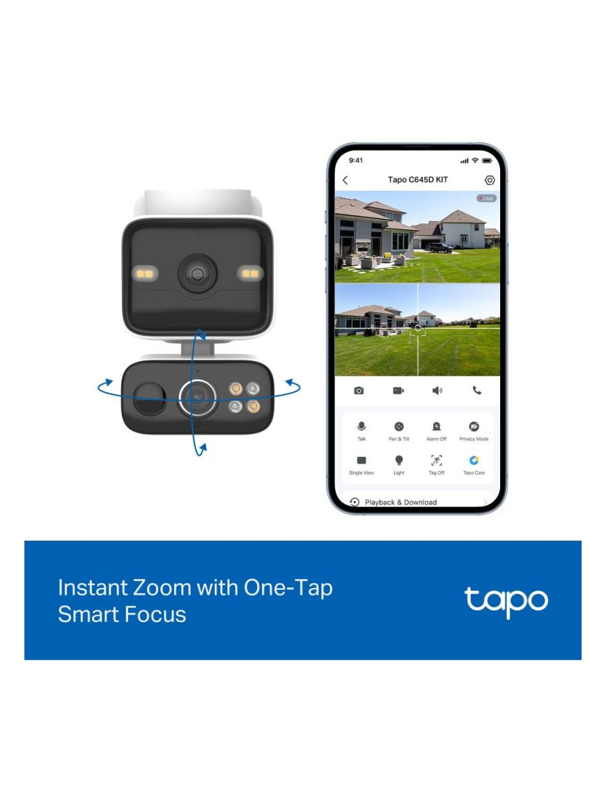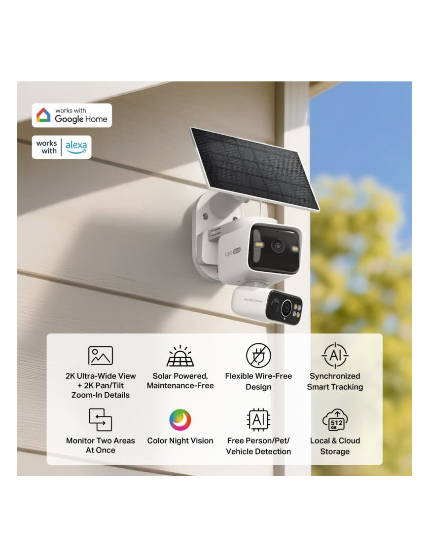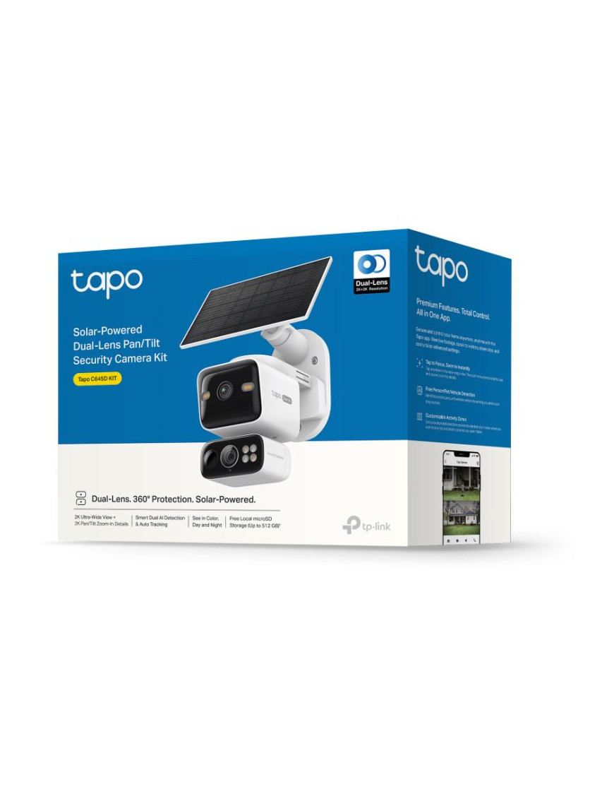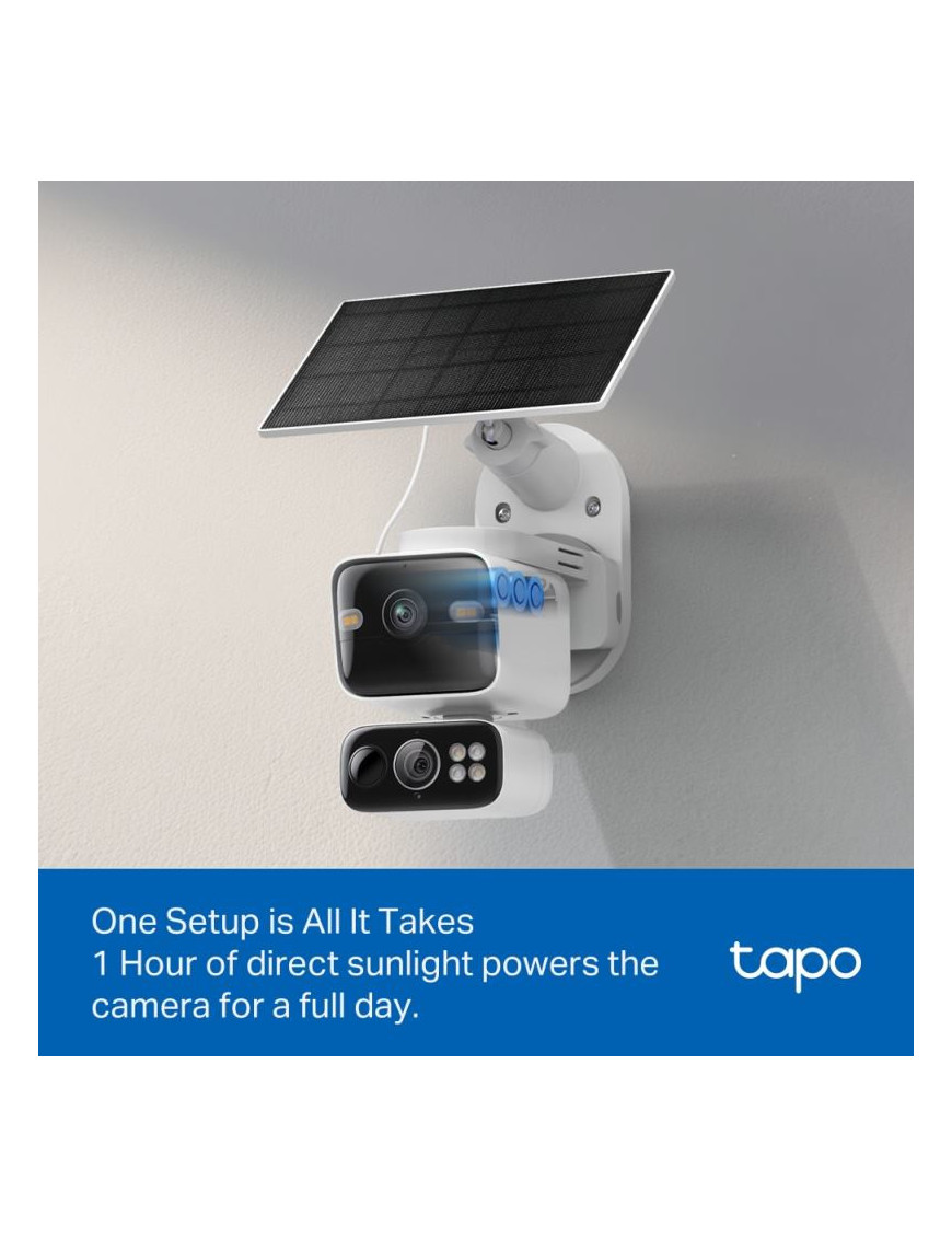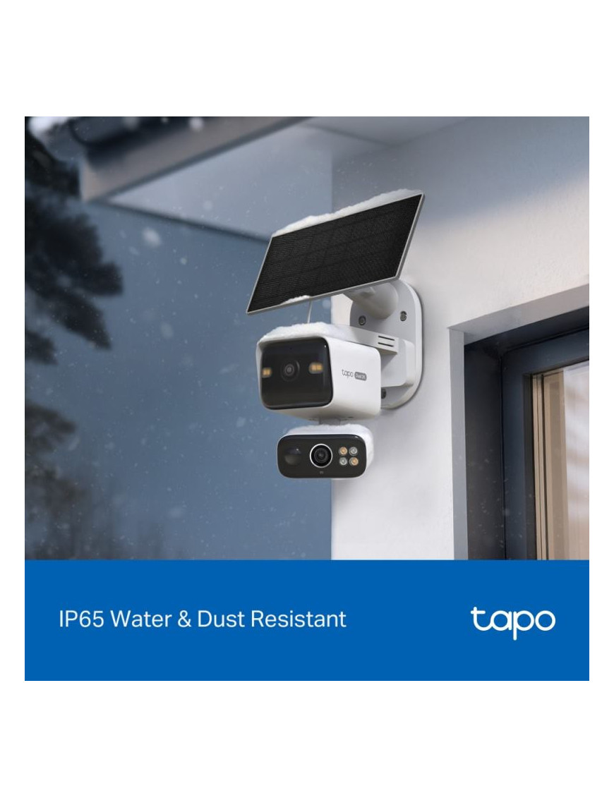 Tapo C645D KIT je solárne napájaná duálna PTZ bezpečnostná kamera s dvomi 2K šošovkami pre široký záber a presný zoom. Ponúka AI detekciu osôb, vozidiel a domácich zvierat bez predplatného. Vďaka synchronizovanému sledovaniu a inteligentnému zaostrovaniu vám neunikne žiaden detail. Solárne napájanie, 10 000 mAh batéria s výdržou 4 mesiace a IP65 odolnosť zaručujú spoľahlivú prevádzku. Disponuje farebným nočným videním, duálnym Wi-Fi a integráciou s Google Assistant/Alexa. Perfektné riešenie pre