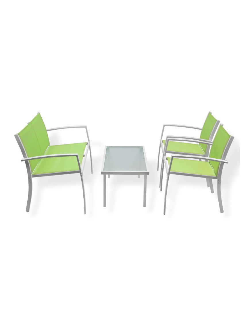 Kovová konštrukcia, umývateľný poťah z umelého vlákna, doska stola z bezpečnostného skla. Súprava obsahuje: 2 stoličky, 1 dvojitá sedačka, 1 stôl. Dodáva sa v demonte Farba: zelená