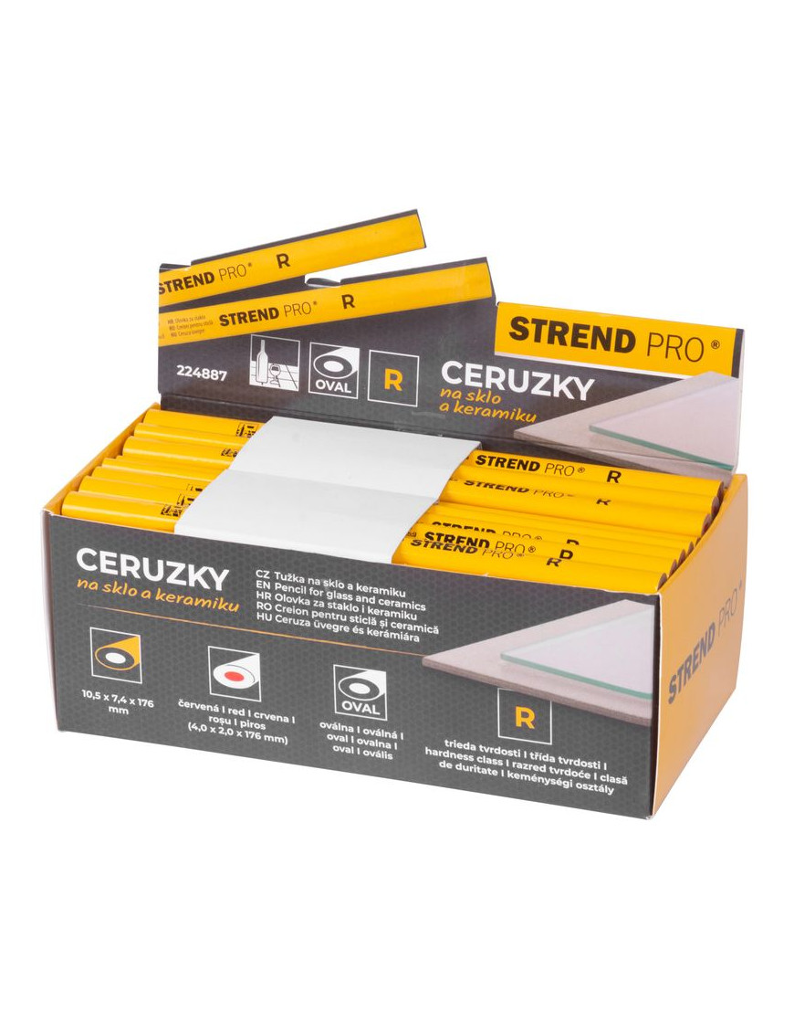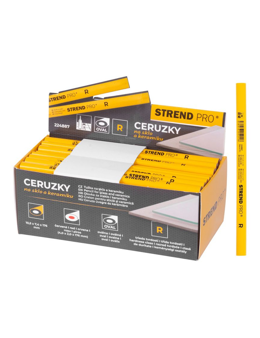 Oválna ceruzka Strend Pro na značenie sklenených a keramických povrchov s červenou tuhou tvrdosti R. Rozmery: 10,5x7,4x176 mm. Balenie obsahuje 72 ks.