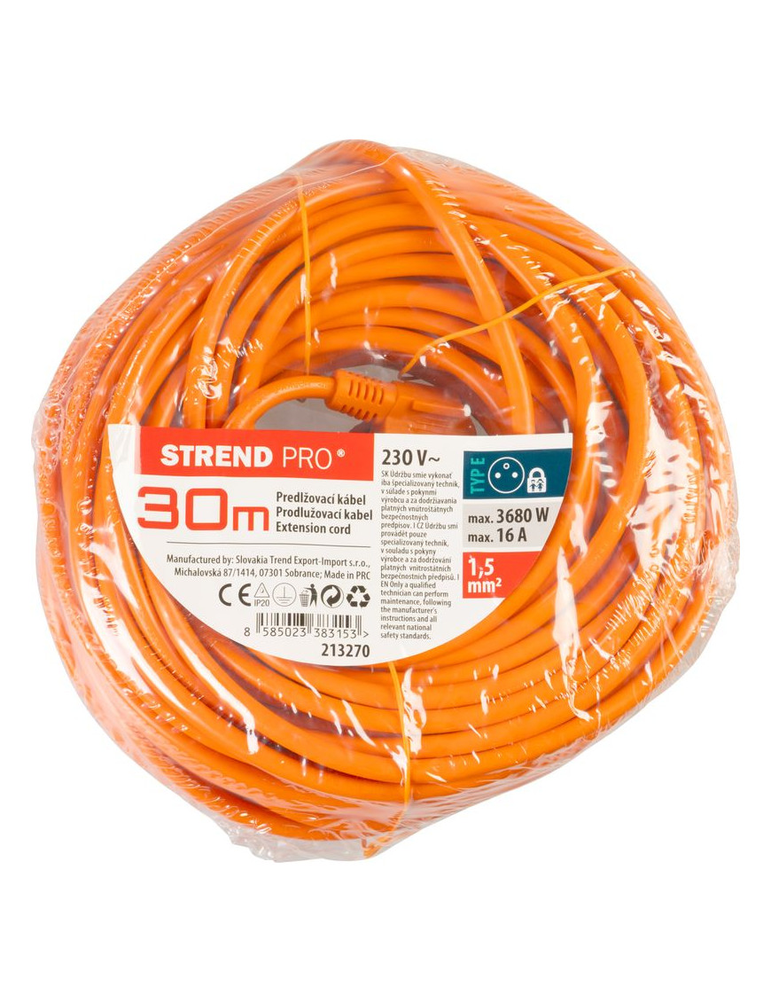 Praktický predlžovací kábel DG-YFB01 v oranžovej farbe zabezpečí prívod elektrickej energie až do dĺžky 30 metrov. Kábel je vhodný na viacero účelov, použiteľný všade, kde bežný kábel nie je dostatočne dlhý. Maximálna záťaž je 3680 W/16A. Priemer medeného kábla je 1,5 mm.