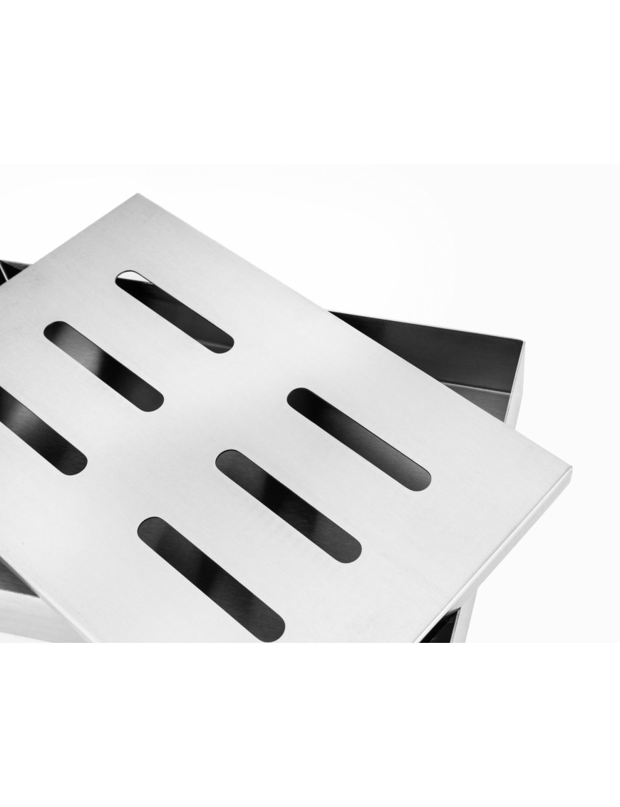 G21 box na údenie s vekom je pevný a stabilný aj pri vysokej teplote vo vnútri grilu. Vyrobili sme ho z nerezu a opatrili otvormi v spodnej stene aj vo veku. Vďaka týmto prieduchom sa dym uvoľňuje von z boxu a plní vnútorný priestor grilu.