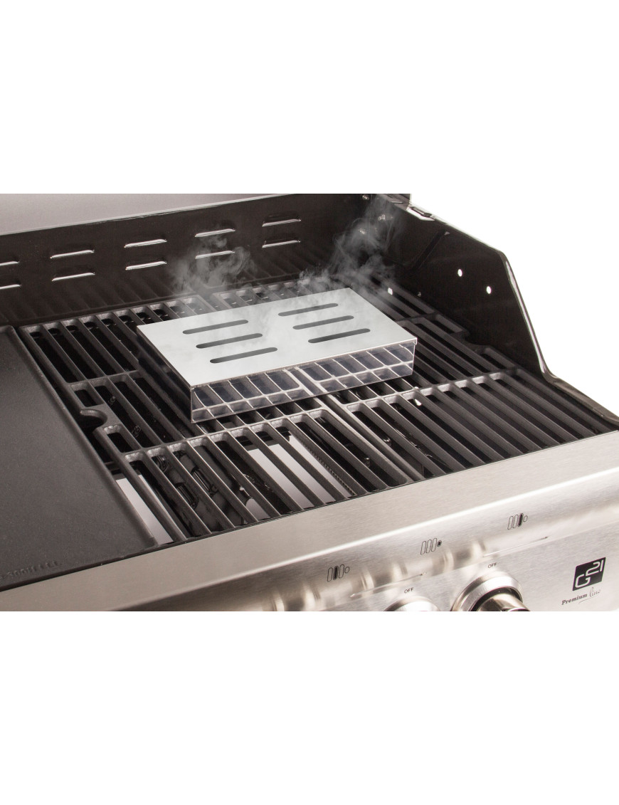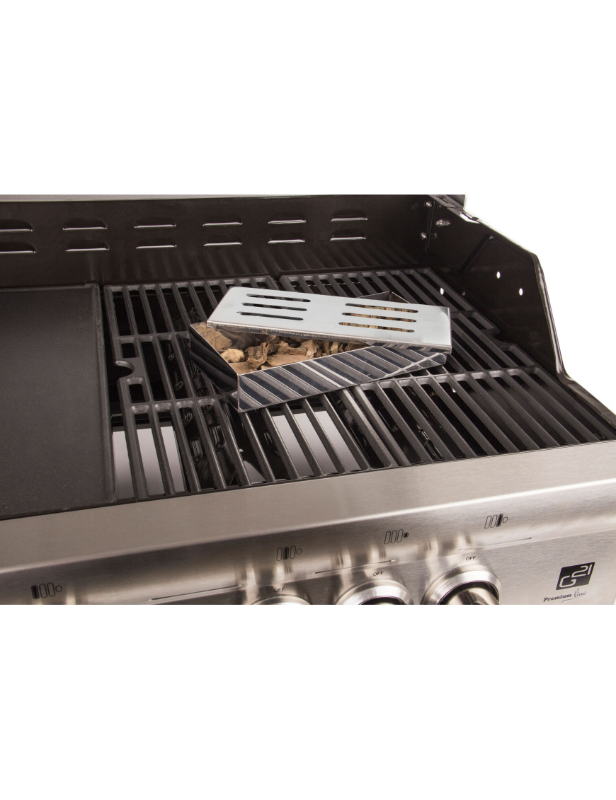 Údiaci box G21 je pri rozmeroch 23 x 13 cm a výške 3 cm kompaktný a medzi horákmi plynového grilu či na rošt grilu na drevené uhlie alebo grilu elektrického ho tak ľahko umiestnite.