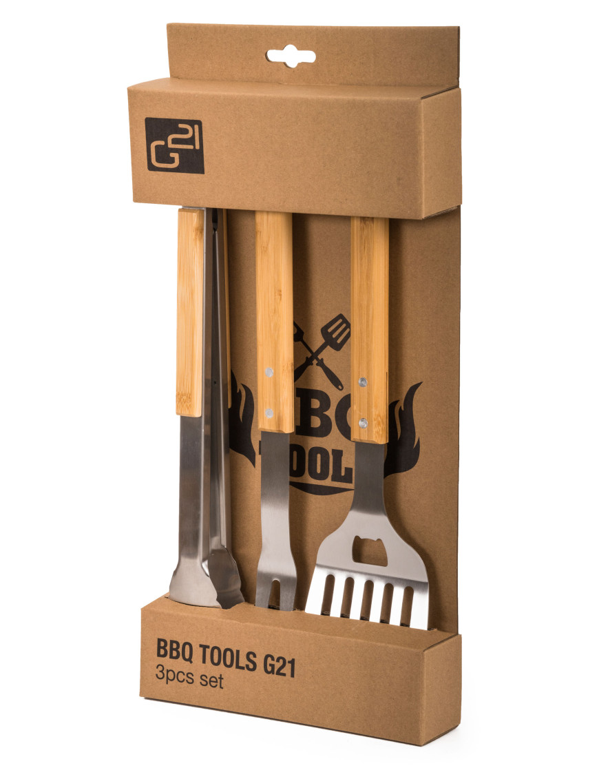 Doprajte si pohodlie pri grilovaní s praktickou 3dielnou sadou G21. Grilovacie náradie je vyrobené z odolnej nerezovej ocele a má štýlové bambusové rukoväte. Vďaka premyslenému spracovaniu skvele vyzerá a zaručuje komfort pri každom grilovaní.