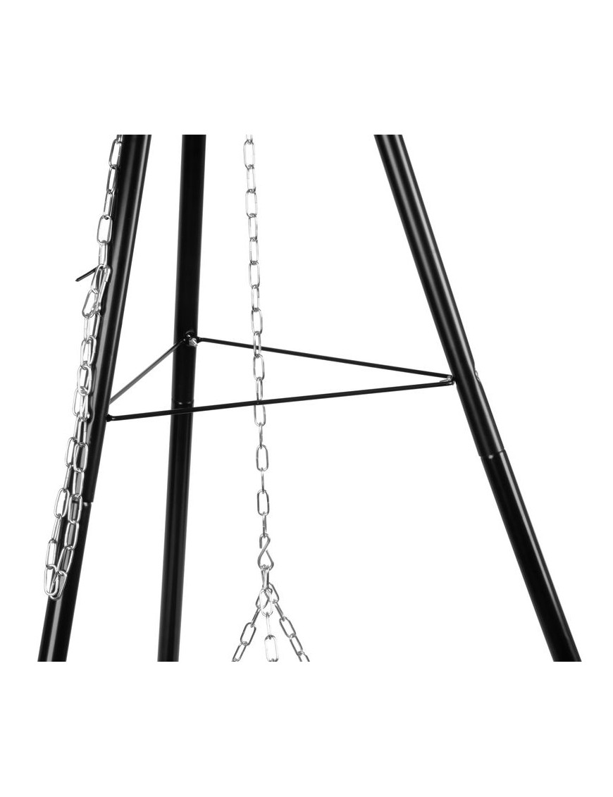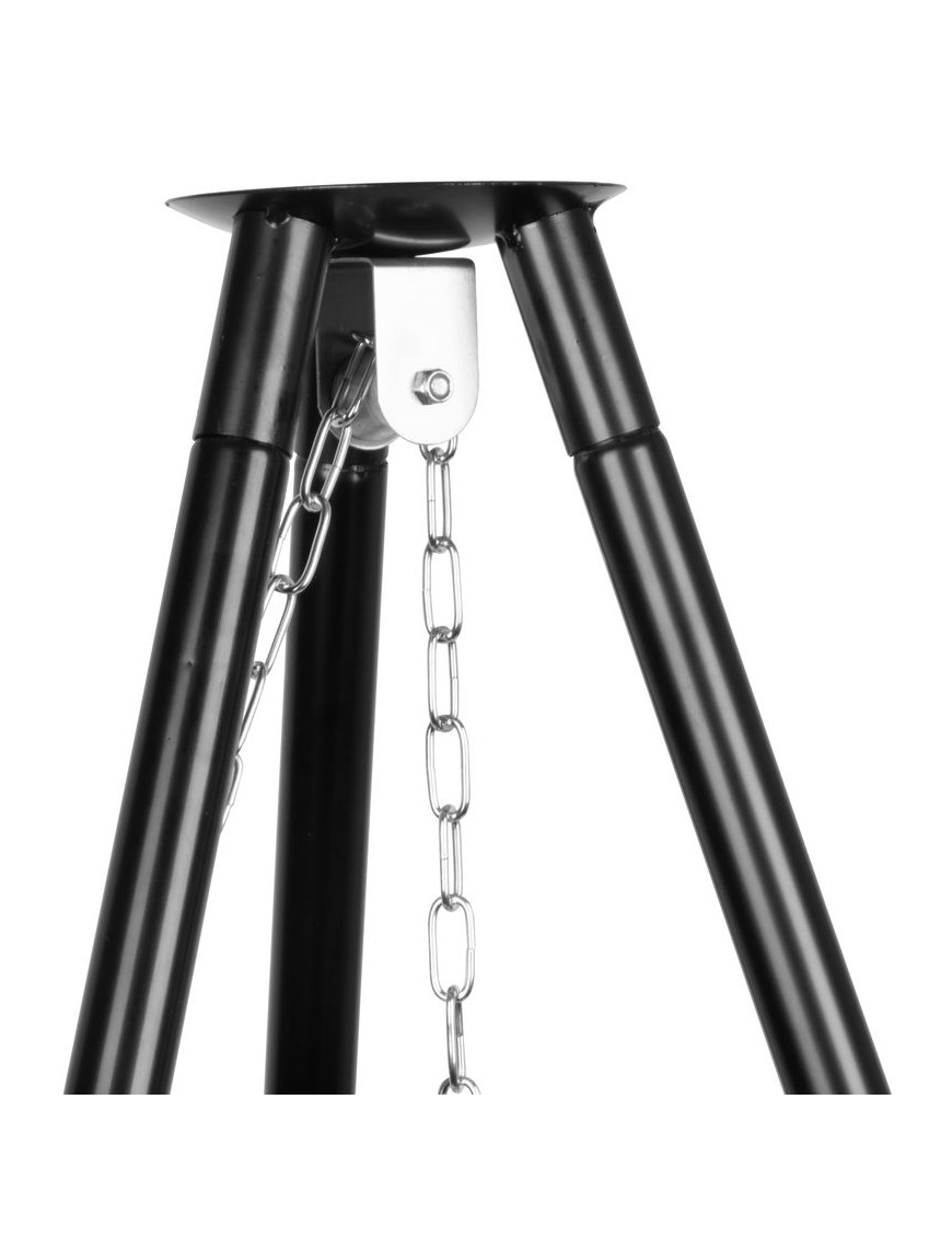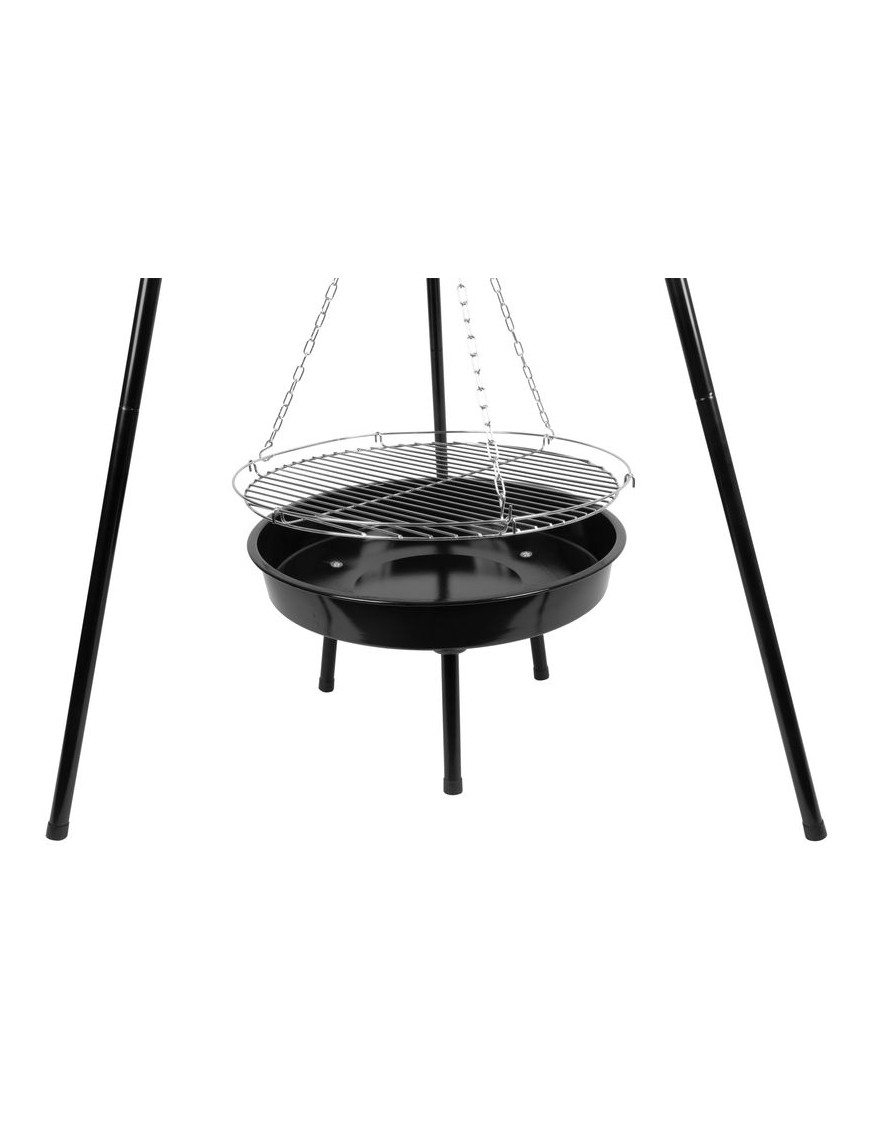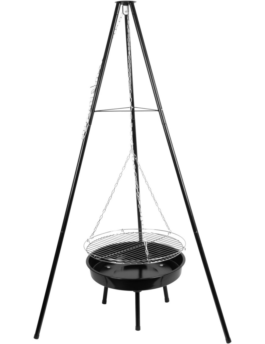 Závesný gril je ideálny typ grilu na grilovanie nie len na záhrade, ale taktiež kdekoľvek v prírode. Vďaka možnosti jeho rozkladu na menšie prenosné časti je manipulácia s ním jednoduchá a samotné zloženie a rozloženie vám nezaberie viac ako pár minút. Jeho výhoda spočíva v zložení z dvoch oddeliteľných častí. Hlavnú konštrukciu tvorí trojnožkový stojan, na ktorý sa následne upevní pozinkovaná reťaz. Posledným krokom je už len zavesenie samotnej grilovacej časti na visiacu reťaz. Príslušná miska sa dá využiť na varenie, vyprážanie alebo umiestnenie uhlia a má hrúbku 0,5 mm. Na misku sa v prípade grilovania umiestni pozinkovaná mriežka, ktorá má rozmery 4,5 x 2,5 mm a celkový priemer varnej plochy je 51 cm. Varná výška je v rozmedzí od 320 do 660 mm. Celý gril je v klasickej čiernej farbe a jeho hmotnosť je iba 4,76 kg.