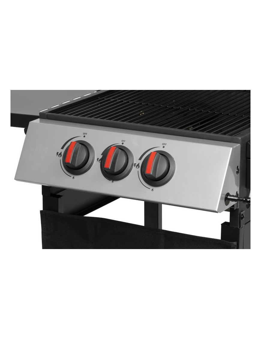 Gril je plynový, s dvomi horákmi pod vrchným kovovým krytom a jedným bočným horákom. Bočný horák je možné použiť pre jednoduché samostatné varenie. Na vrchnom kovovom kryte je umiestnený teplomer z nehrdzavejúcej ocele, vďaka ktorému nie je nutné neustále kontrolovať pripravované jedlo. Varná mriežka, ktorá sa nachádza pod krytom je vyrobená zo smaltovanej ocele, čím sa veľmi ľahko čistí, rovnako ako aj zvyšok povrchu. Pre funkčnosť je potrebné pripojenie štandardnej plynovej fľaše s hmotnosťou náplne do 11 kg. Po jej pripojení stačí jednoducho otočiť gombíkom pre horák, ktorý chcete rozohriať. Rozmery grilu sú 97 x 60 x 100 cm a jeho hmotnosť je 17,5 kg. Pre jednoduchší presun sa na spodných nohách nachádzajú dve kolieska. Po umiestnení plynovej fľaše je potrebné skontrolovať pripoj...