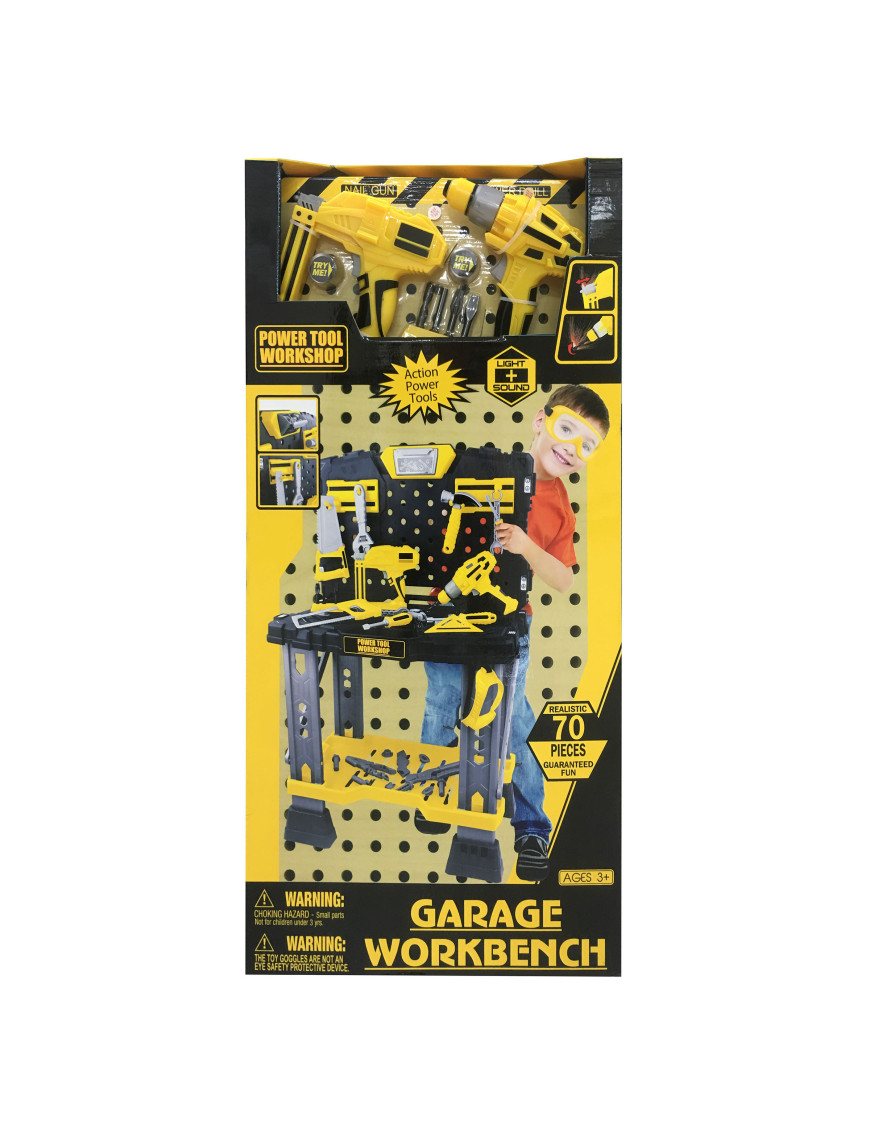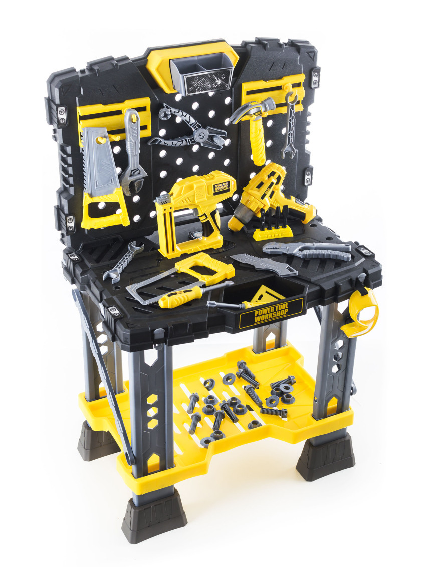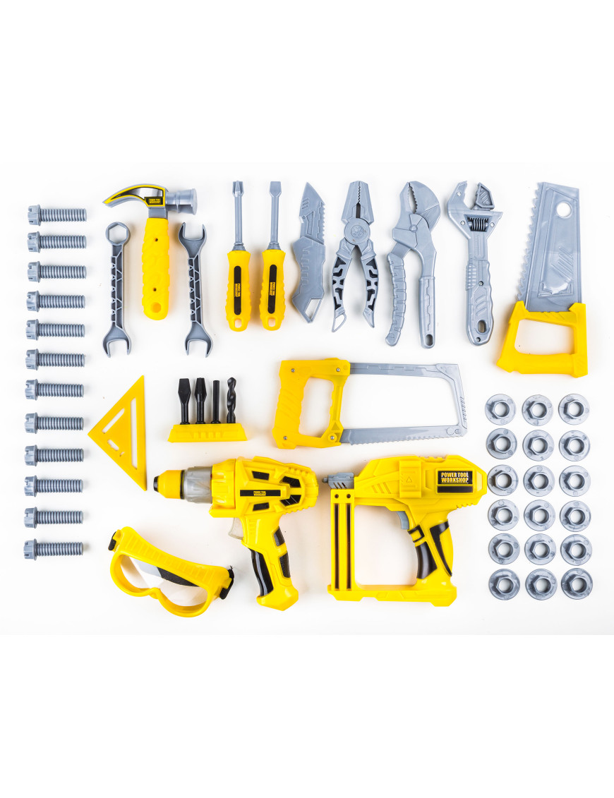 V sade nájdete vŕtačku s vrtákmi, klincovačku, kľúče, skrutky, matky, kladivo, skrutkovač, píly, podložky na vŕtanie, meter, uhlomer, kliešte, ochranné okuliare a mnoho ďalšieho. Skrátka všetko, čo je v dielni potreba. Hra s náradím zlepšuje deťom motoriku, cvičí ich trpezlivosť a hlavne im prinesie veľa zábavy.