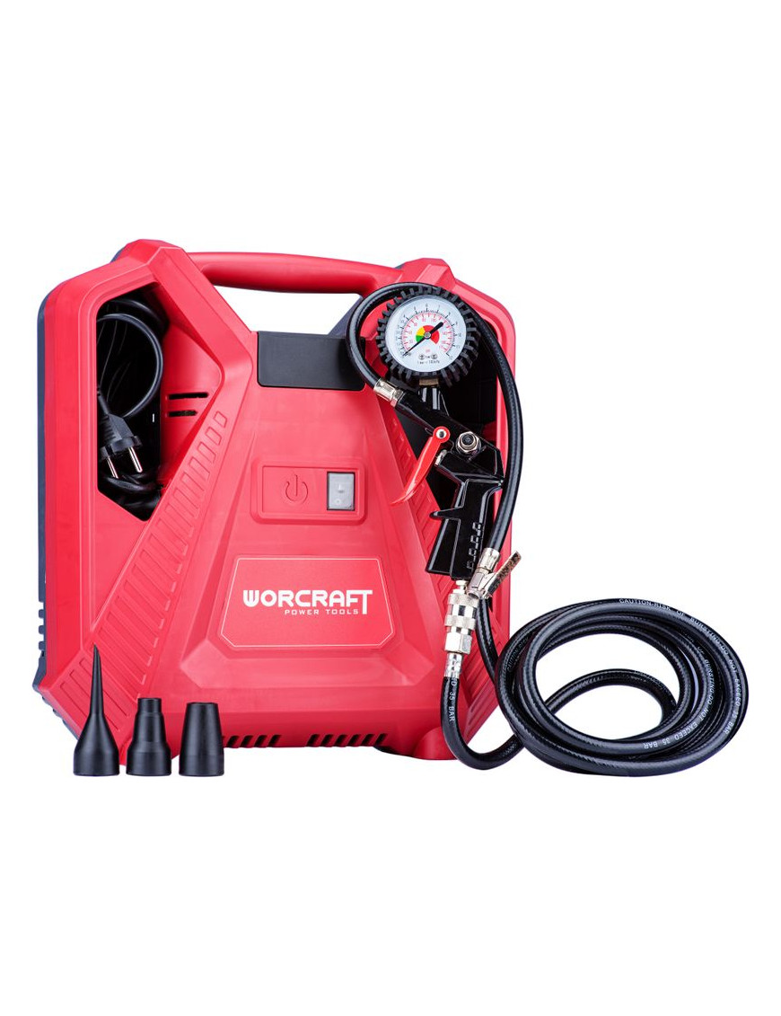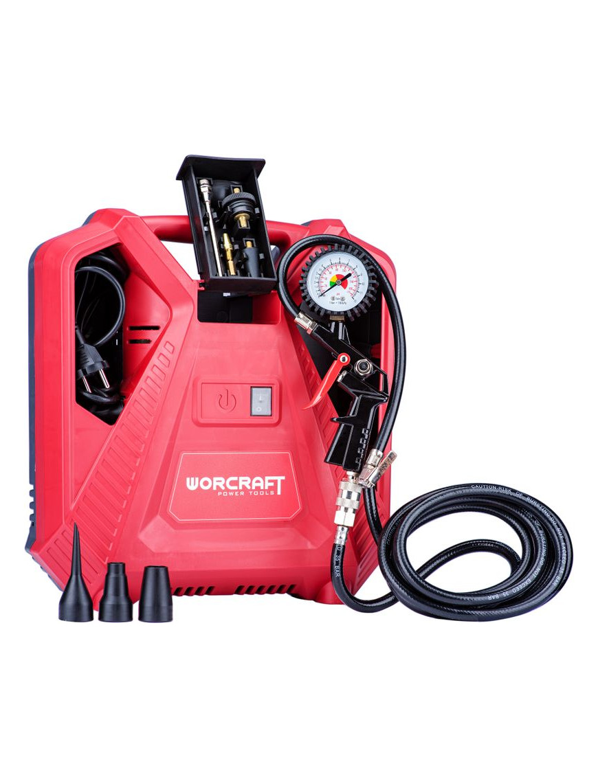 Bezolejový kufríkový kompresor WORCRAFT PAC11-180 je ideálnym pomocníkom do dielne či na cesty. Vďaka veľkému množstvu rôznych koncoviek si hravo poradí s fúkaním pneumatík motocyklov, bicyklov, áut, terénnych štvorkoliek, lôpt, matracov, nafukovacích člnov, raftov a pod. Výhodou je aj silný motor, ktorý má príkon 1,1kW a vysoký pracovný tlak, nastaviteľný až do 8 bar.