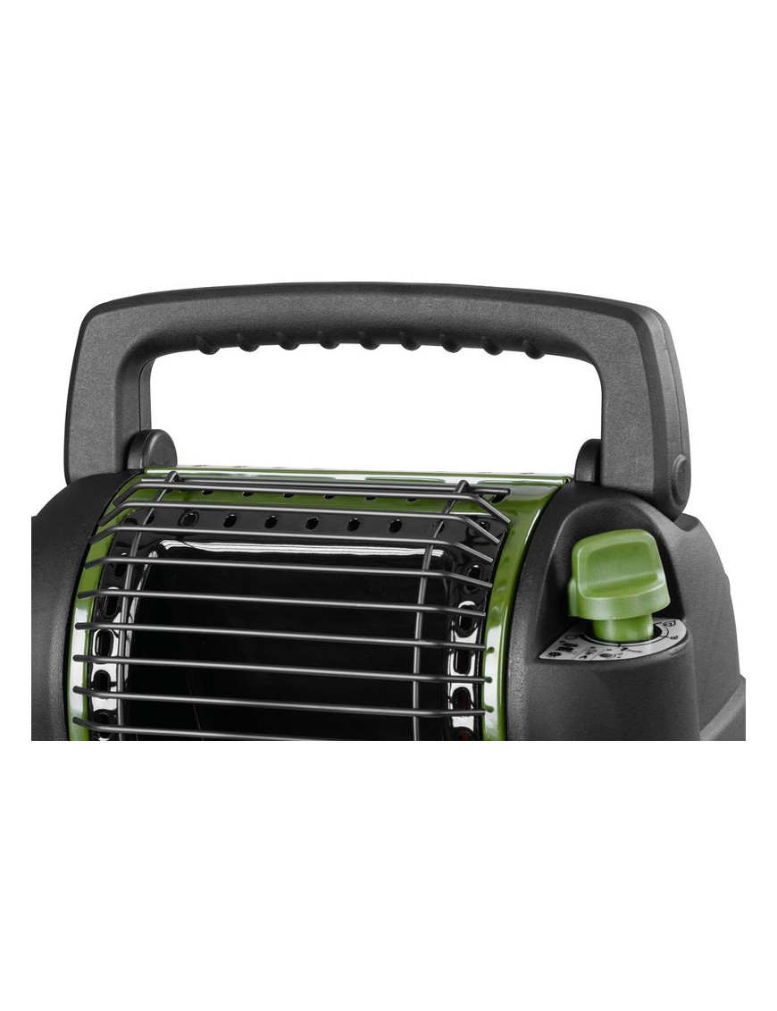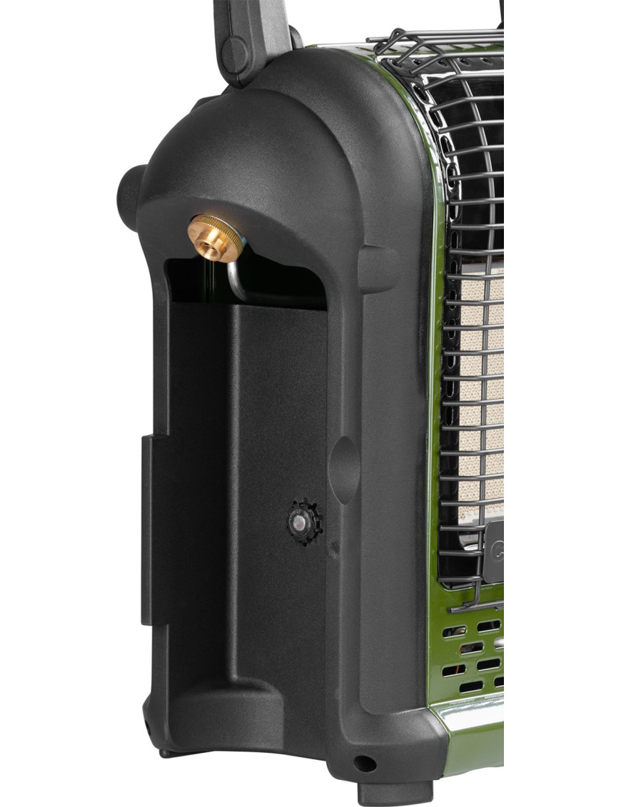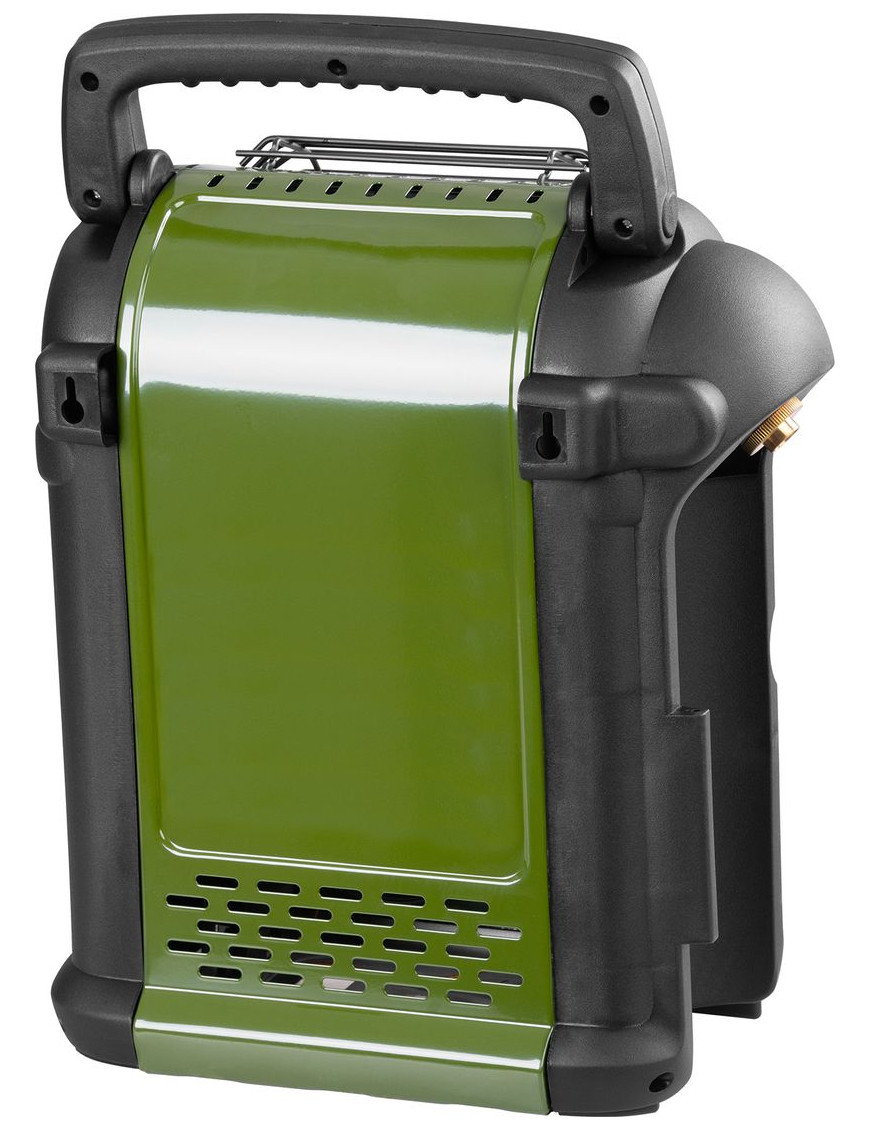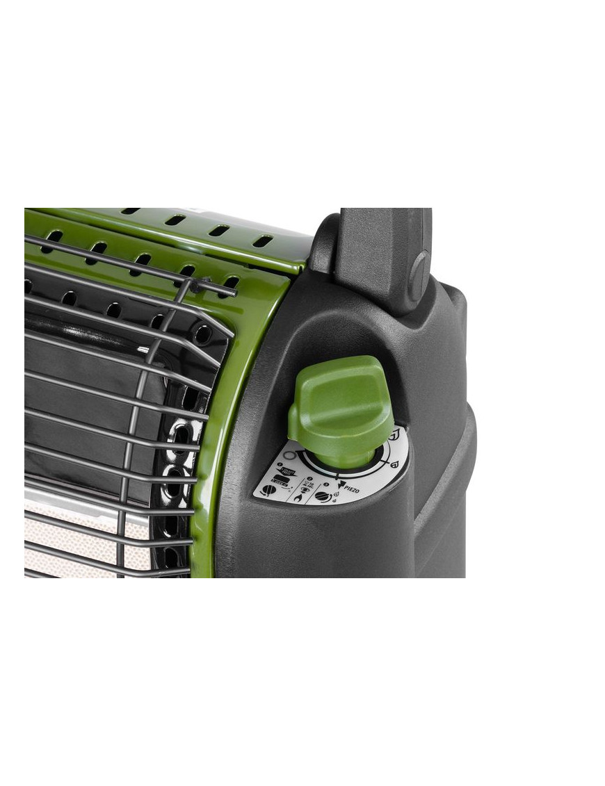 - poistka proti náklonu - v prípade nebezpečného náklonu alebo prevrátenia sa ohrievač aj prívod plynu automaticky vypnú. Druh plynu: propán-butánová zmes. Používa sa len s kartušou s ventilom ( a závitom 7/16") s obsahom 230 g (typ KP02006) alebo 450 g (typ KP02007) ( ktorá vyhovuje EN417), plnenou propán-butánom (kartušou na jedno použitie). Kartuša nie je súčasťou balenia. Rozmery: 35x21x39 cm.