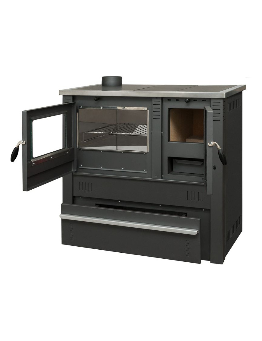 Robustný sporák Pro PANONIA Steel s ľavým vývodom je navrhnutý na efektívne varenie a príležitostné vykurovanie. Spoľahlivý výkon a moderný dizajn robia z tohto sporáka praktický doplnok do vašej domácnosti.
