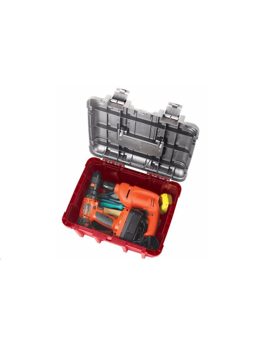 Bezpečný uzatvárací systém istia robustné kovové západky, ktoré chránia obsah pred vysypaním počas prepravy. Široká rukoväť s vrúbkovanou časťou pre dlaň spríjemní nosenie náradia na miesto potreby.