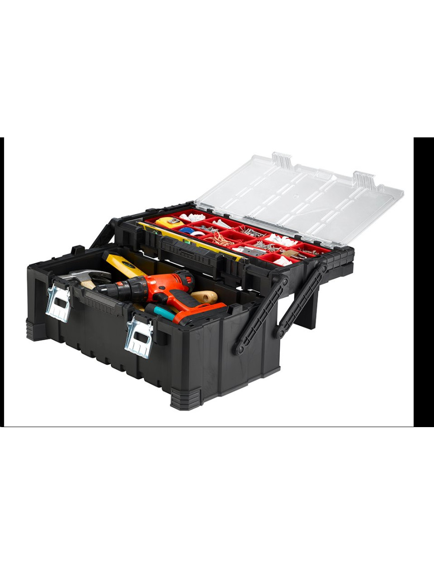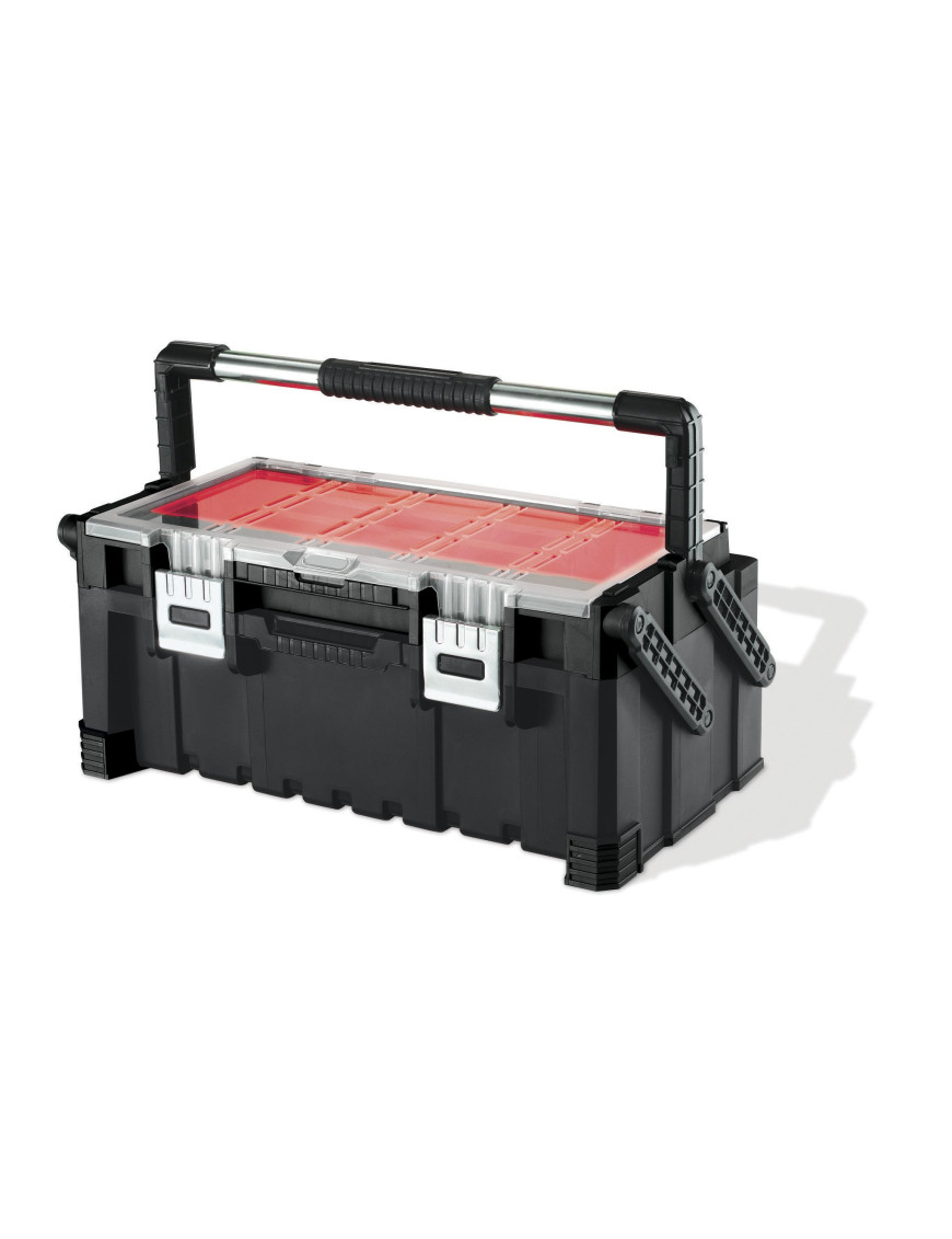 26litrový objem, váha 3,4 kg a kompaktné rozmery. Konzolový dizajn a priehľadné veko vám maximálne sprístupní obsah boxu. 11 vyberateľných priehradiek v dvoch veľkostiach, oporné nohy, kovové madlo a pracky.