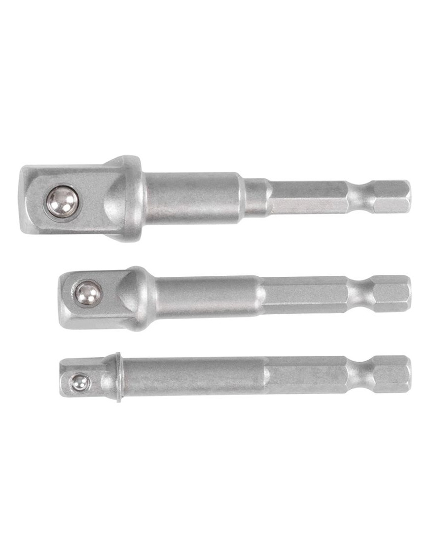 Praktická sada adaptérov Strend Pro do vŕtačky na použitie s nadstavcami obsahuje 3 ks adaptérov s rozmermi 1/4", 1/2" a 3/8".