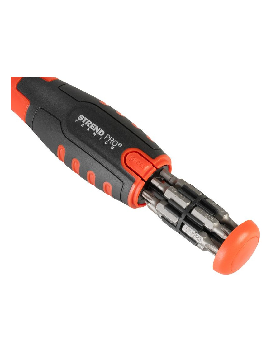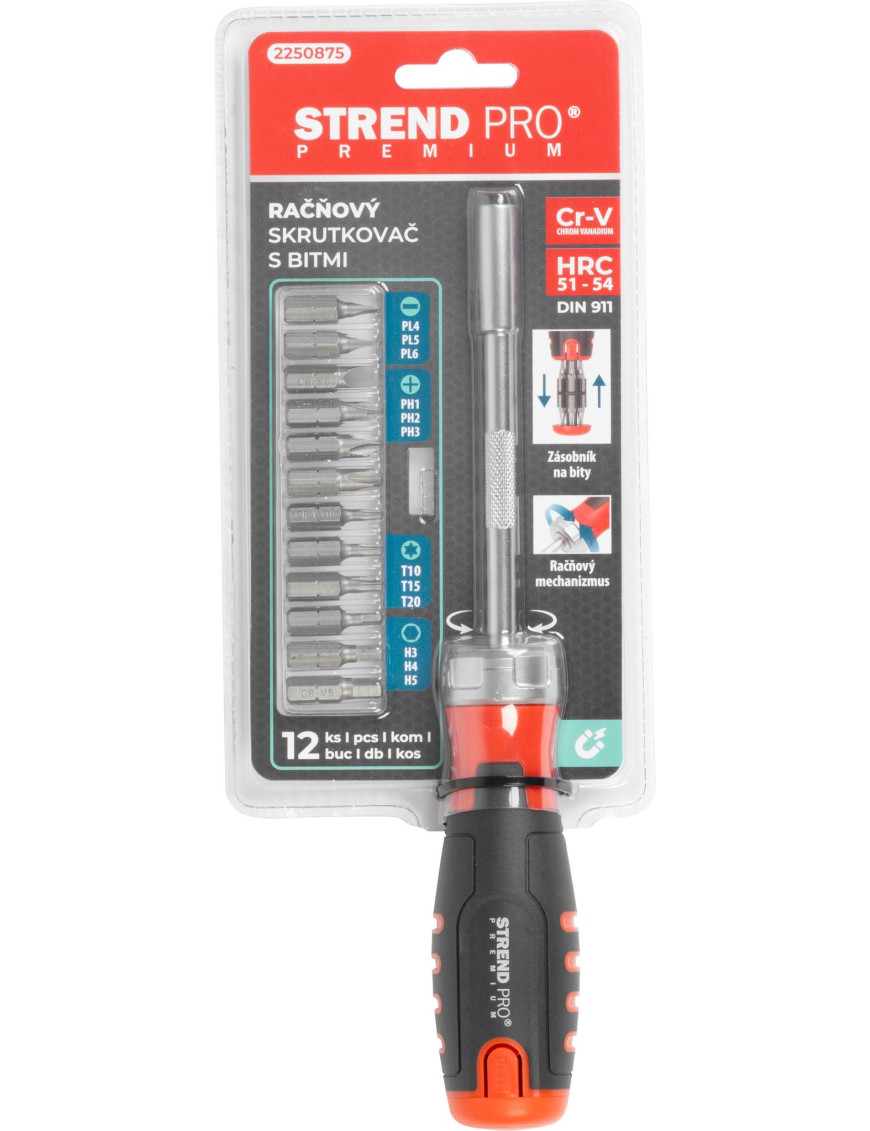 Skrutkovač Strend Pro Premium so sadou 12 bitov je univerzálny a praktický nástroj pre rôzne montážne a opravárske práce. Obsahuje bity Torx, ploché a Phillips, čo umožňuje široké využitie v dielni aj domácnosti.