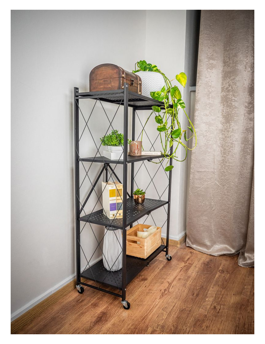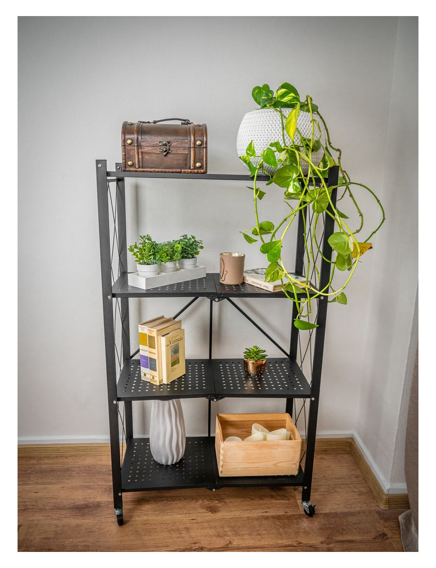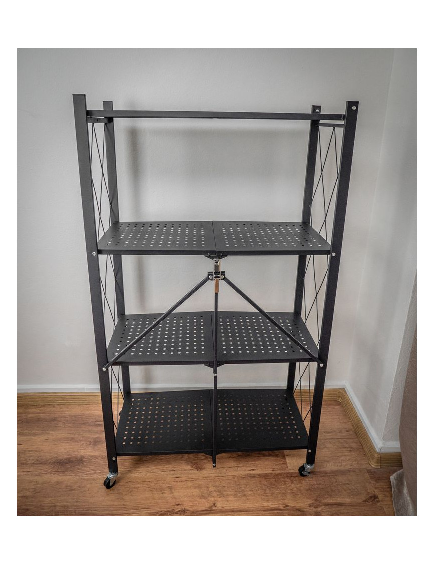4-policový skladací a pojazdný regál MagicHome je praktický pomocník v domácnosti všade tam, kde potrebujete niečo uskladniť. Regál je celý kovový v elegantnom dizajne, jeho celková nosnosť je 200 kg a nosnosť jednej police je 50 kg pri rovnomernom zaťažení. Hlavnou výhodou regálu je jeho skladnosť a pojazdnosť. Vrchná časť sa jednoducho odmontuje a zvyšné police sa dajú jednoducho sklopiť, preto keď ho nepoužívate, jednoducho ho odložíte a vyberiete v prípade potreby. Keďže je postavený na 4 kolieskach, veľmi jednoducho ho presuniete a zabrzdíte 2 brzdami. Celkové rozmery regálu: 127x72x34 cm.