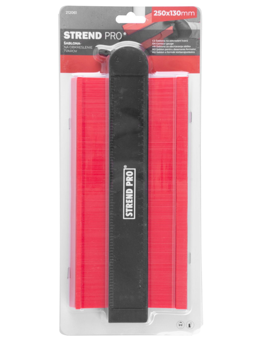 Šablóna na obkreslenie tvarov Strend Pro sa používa na presné označenie tvarov pre rezanie a montáž dlaždíc, podláh, kobercov, vodovodných potrubí. Jej súčasťou je i magnet pre lepšie prichytenie. Rozmery: 250x130 mm.