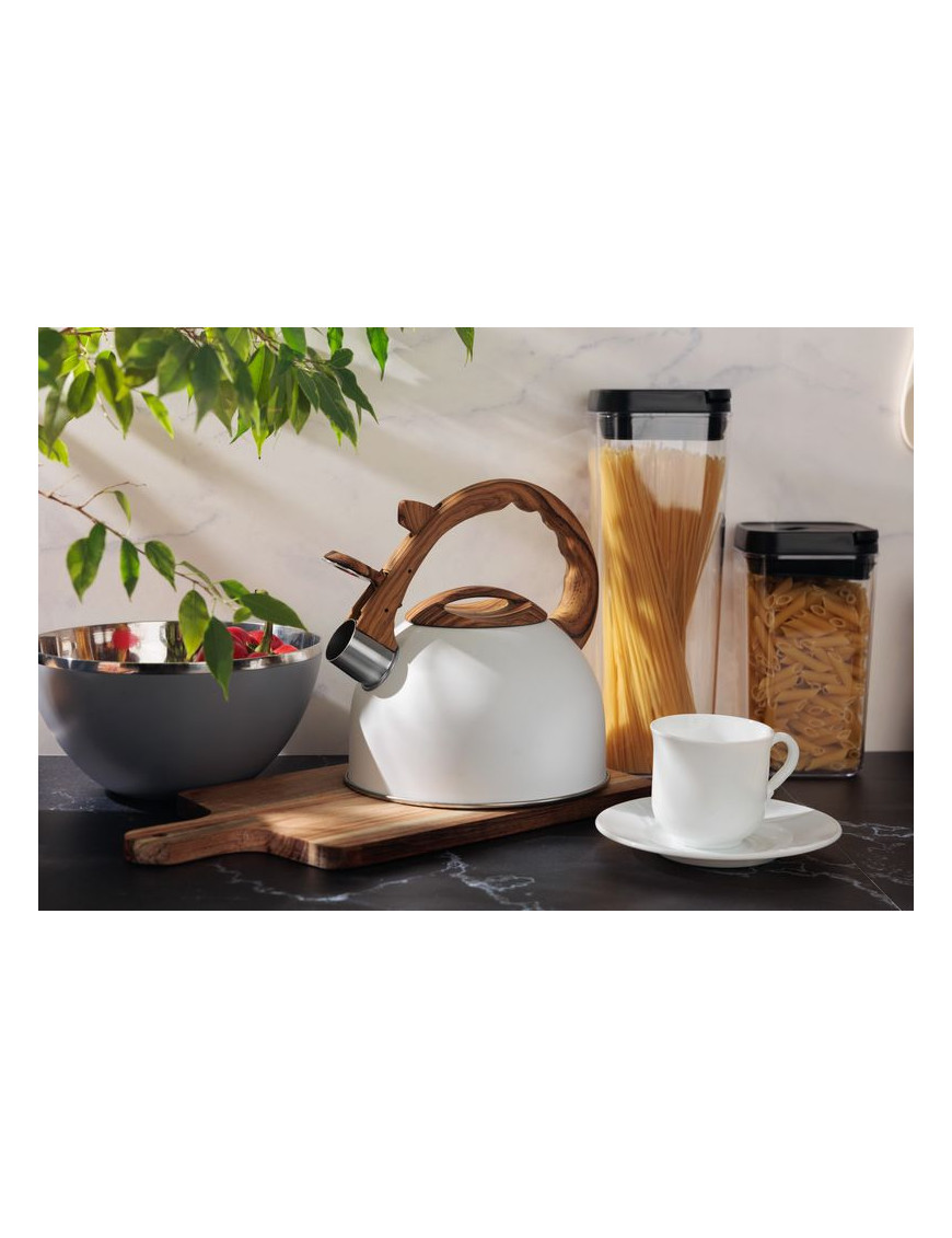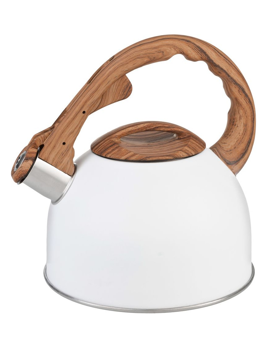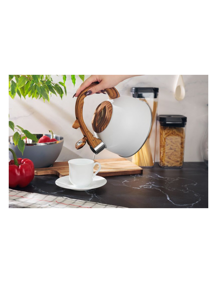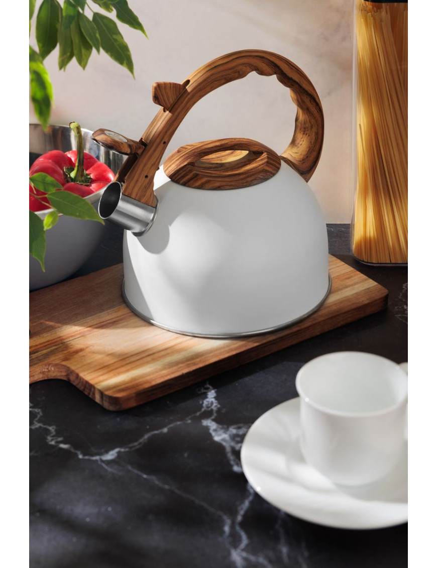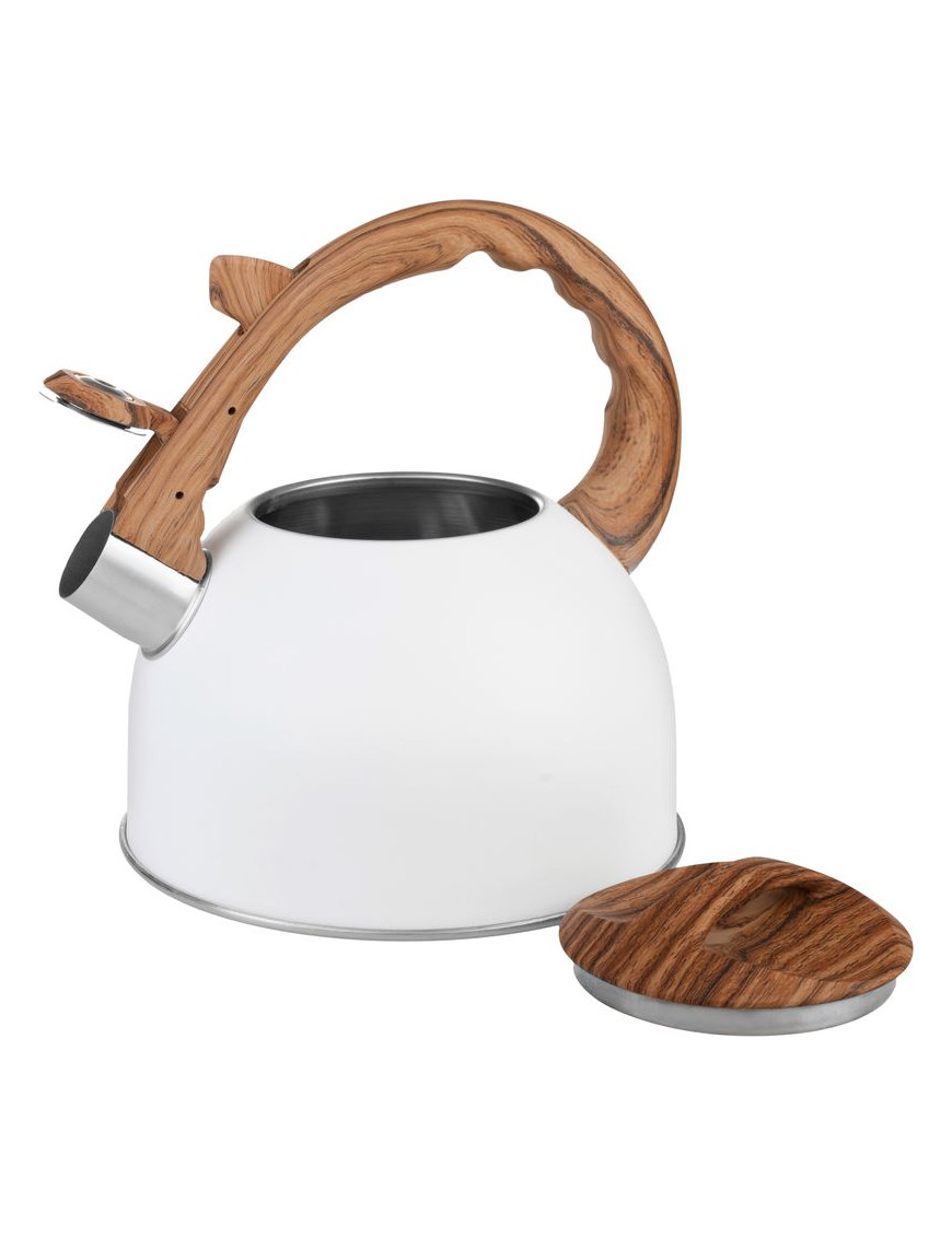 Tento štýlový čajník v bielej farbe s objemom 2500 ml je ideálny pre každodenné použitie. S pískacou funkciou a moderným dizajnom s imitáciou dreva na rúčke a veku sa stane nielen praktickým, ale aj dekoratívnym prvkom vašej kuchyne.