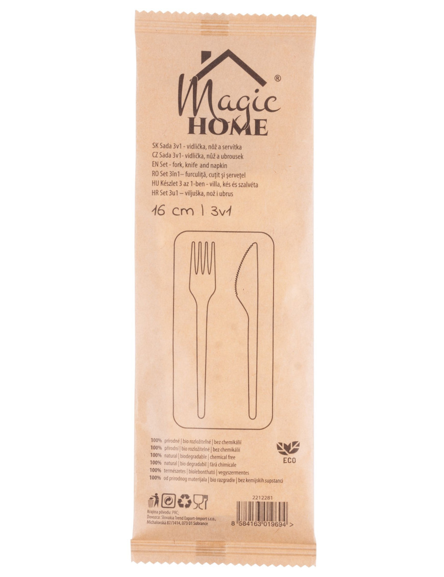 Príbor MagicHome Woodline ECO, drevený, nôž, vidlička, servítka, 100% Natural