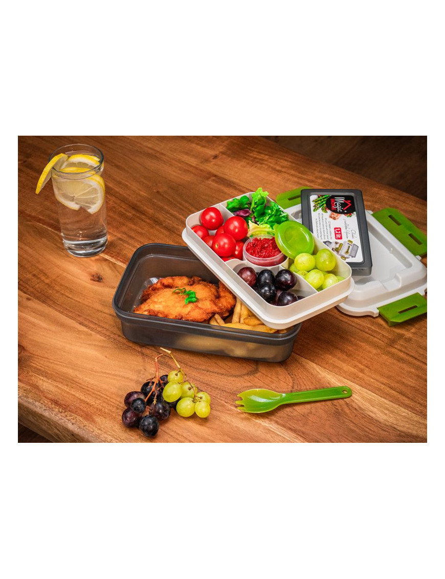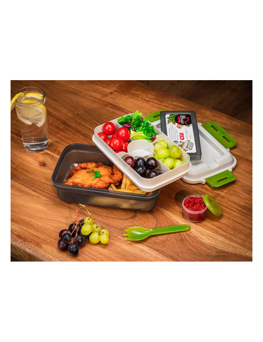 Plastový obedár MagicHome je určený na prenášanie potravín a jedál. Obsahuje vidličku/lyžicu a misku s priehradkami, prostredníctvom ktorých budete mať rozdelené jednotlivé pokrmy. Obedár má 1,2 litrový objem. Plastový obedár môžete umývať v umývačke riadu, odkladať v chladničke i mrazničke. Rozmer : 23x15x8,8 cm.