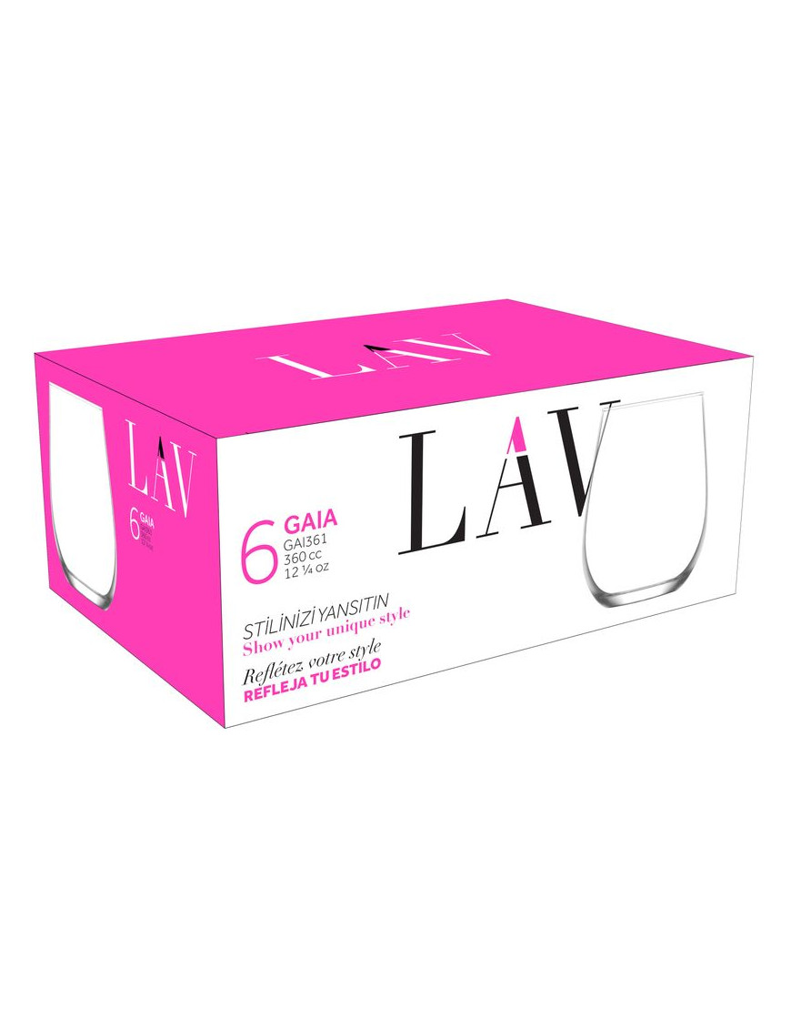Sada obsahuje 6 kusov pohárov Gaia s rozmermi 63x100 mm a objemom 360 ml. Tieto poháre slúžia na podávanie vody a ďalších nealkoholických nápojov, no hodia sa aj na podávanie alkoholických nápojov a rôznych dobrôt ako napríklad zmrzlina. Pohár Gaia vďaka svojmu tvaru dobré padne do dlane. Môže sa umývať v umývačke riadu.