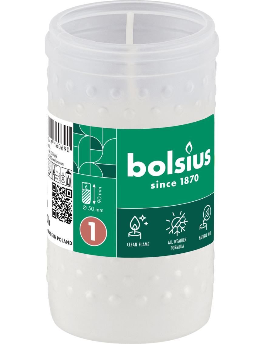 Klasická biela parafínová náplň Bolsius. Vyhorí až do konca, horí krásnym rovnomerným plameňom aj pri vysokej vlhkosti, veternom počasí alebo mraze. Nedymí, nefarbí a neničí lampáše. Nádobka na kartuše vyrobená z kvalitného svetlo prepúšťajúceho materiálu umožňuje jej stabilné umiestnenie v lampáši a zabraňuje vytekaniu vosku. Doba horenia – 20 hodín. Paletové množstvo: 6300 ks. Balenie obsahuje 35 ks.