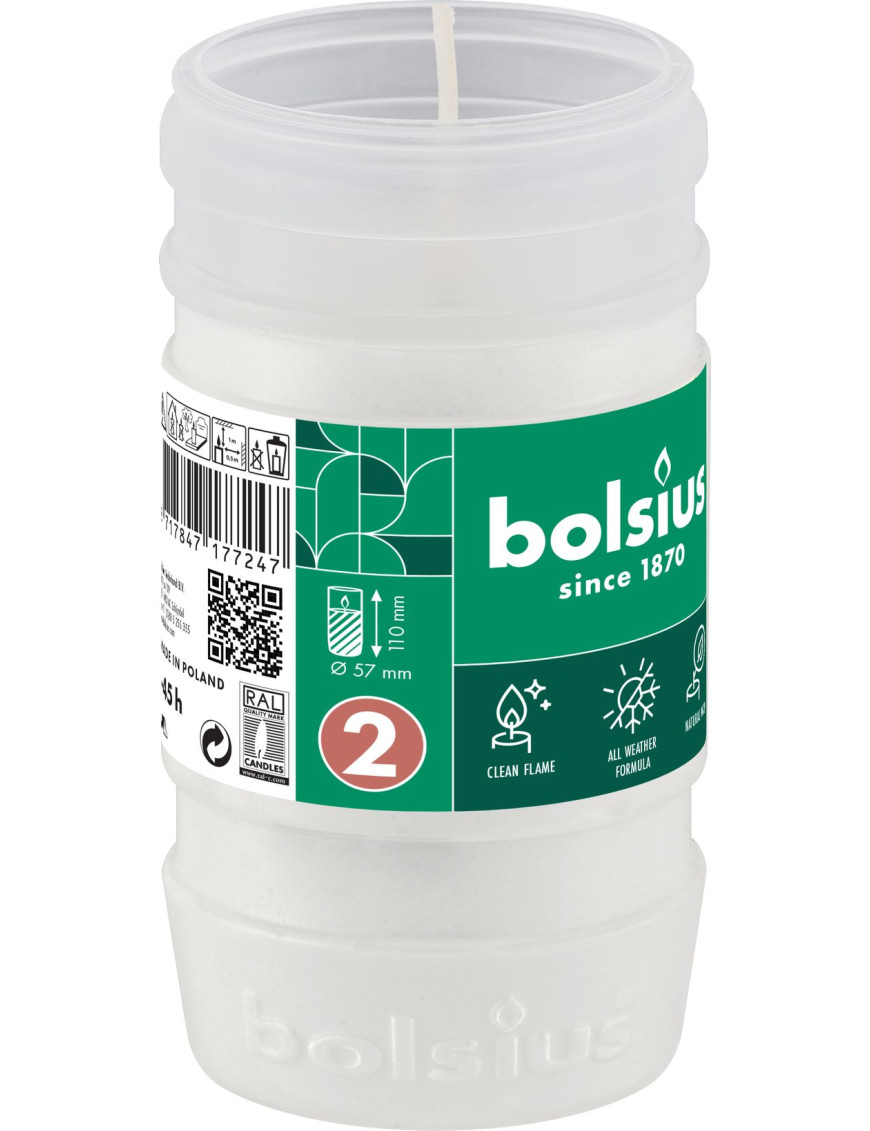 Klasická biela parafínová náplň Bolsius. Vyhorí až do konca, horí krásnym rovnomerným plameňom aj pri vysokej vlhkosti, veternom počasí alebo mraze. Nedymí, nefarbí a neničí lampáše. Nádobka na kartuše vyrobená z kvalitného svetlo prepúšťajúceho materiálu umožňuje jej stabilné umiestnenie v lampáši a zabraňuje vytekaniu vosku. Doba horenia – 45 hodín. Paletové množstvo: 3640 ks. Balenie obsahuje 20 ks.