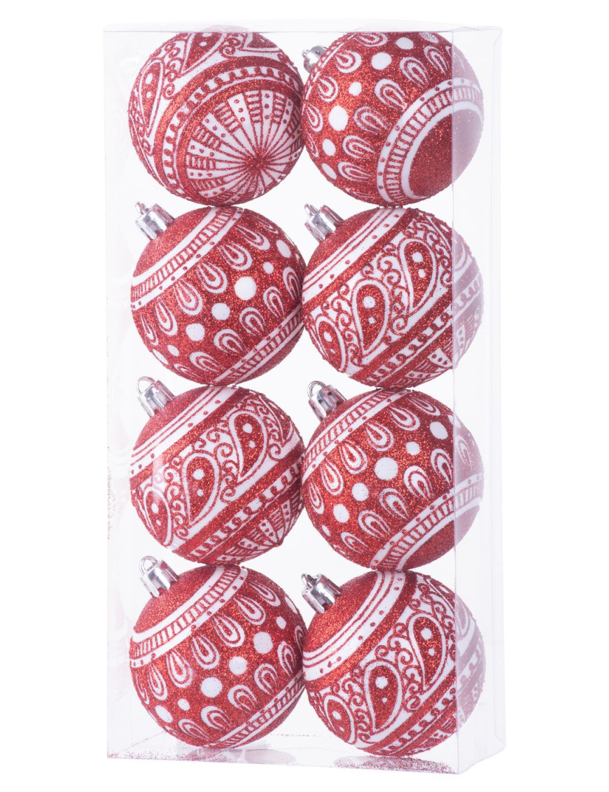 Súprava ozdôb na stromček slúži na slávnostné ozdobenie vianočného stromčeka. Pozostáva z 8 ks vianočných gulí s bielym ornamentom a s priemerom 6 cm. Farba gulí je červená. Sú vyrobené z plastu.