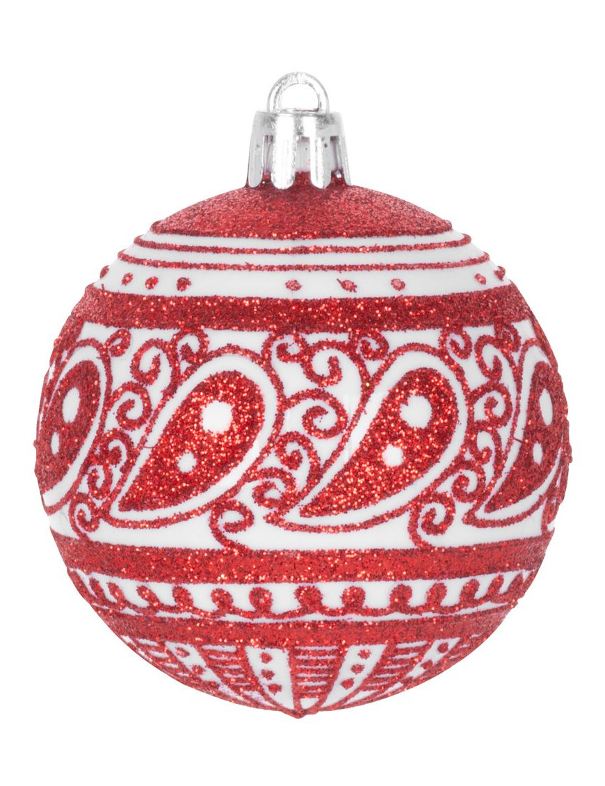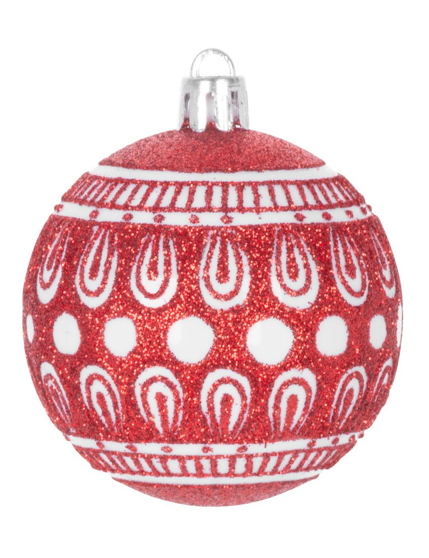 Gule MagicHome Vianoce, 8 ks, 6 cm, červené s bielym ornamentom, s glitrami, na vianočný stromček