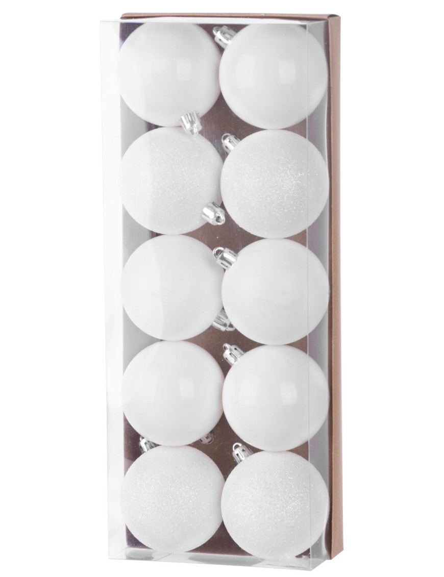 Súprava ozdôb na stromček slúži na slávnostné ozdobenie vianočného stromčeka. Pozostáva z 10 ks vianočných gúľ s priemerom 6 cm. Farba gúľ je biela. Sú vyrobené z plastu.
