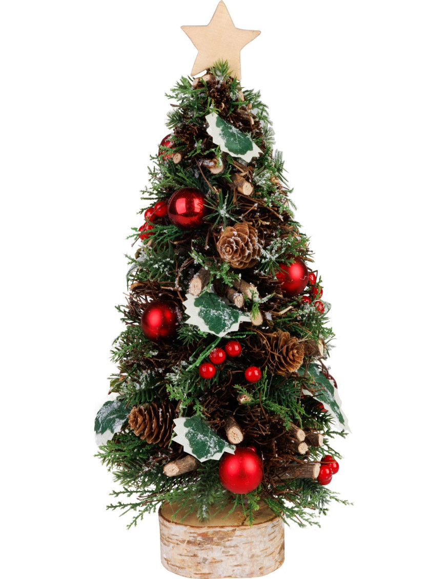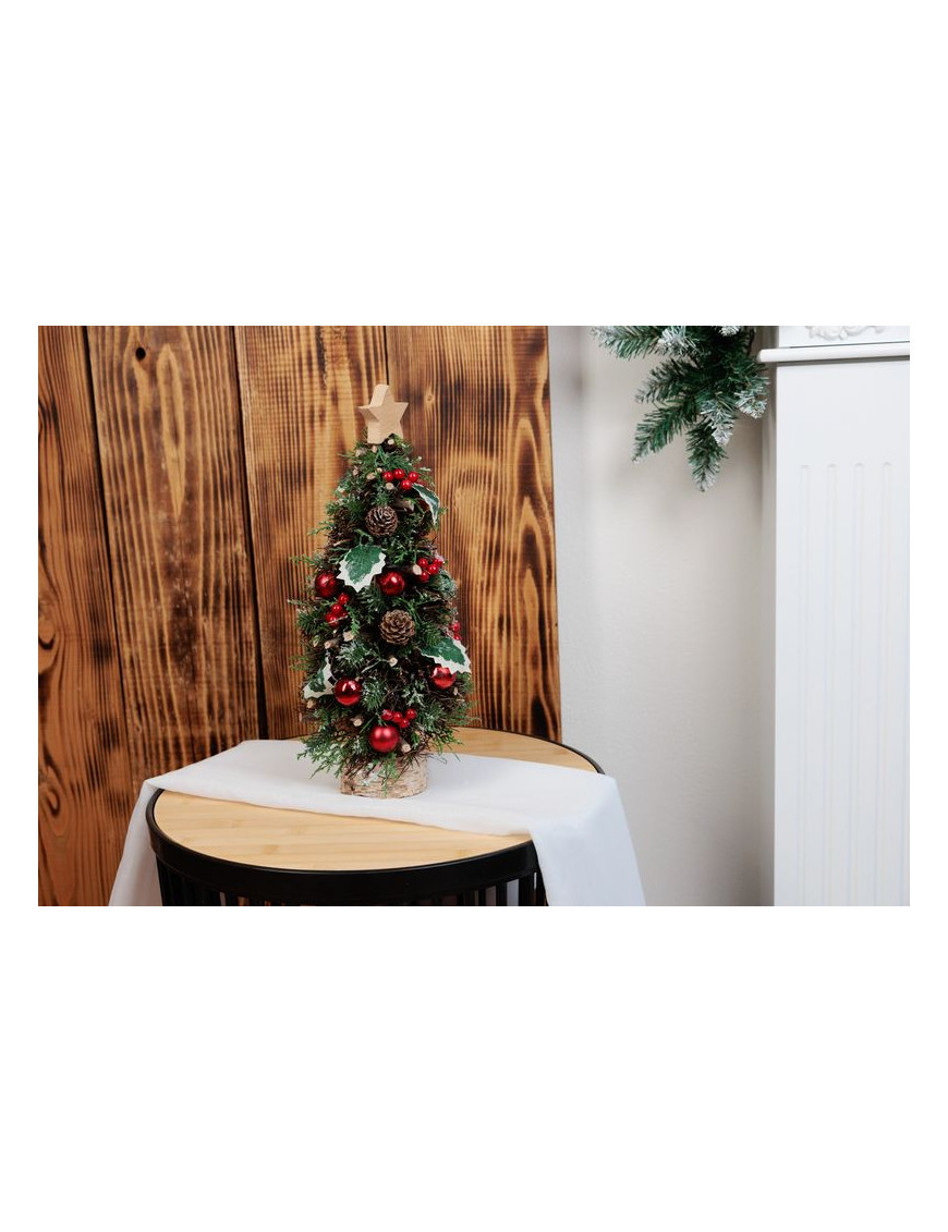 Pridajte sviatočný šarm do vášho interiéru s týmto malým vianočným stromčekom na podstavci. S výškou 40 cm a základňou s praktickými rozmermi 18x18 cm, tento stromček je ozdobený elegantnou hviezdou na vrchole, čo mu dodáva špeciálny vianočný nádych. Ideálny na stôl alebo menšie plochy.