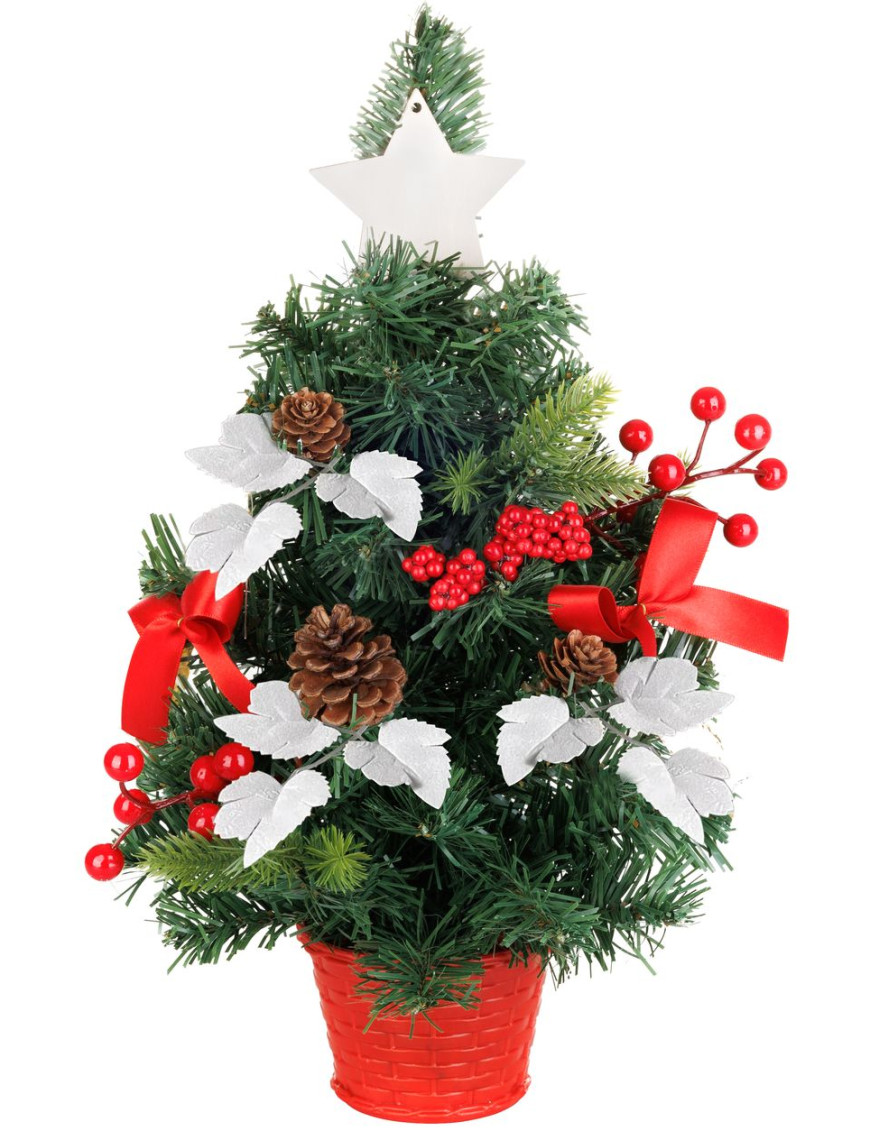 Oživte sviatočnú atmosféru s týmto malým, 40 cm vysokým vianočným stromčekom. Je ozdobený v krásnej červenej farbe a bohatými listami, ktoré pridávajú na jeho šarmantnom vzhľade. Ideálny na ozdobenie menších priestorov alebo stolov.