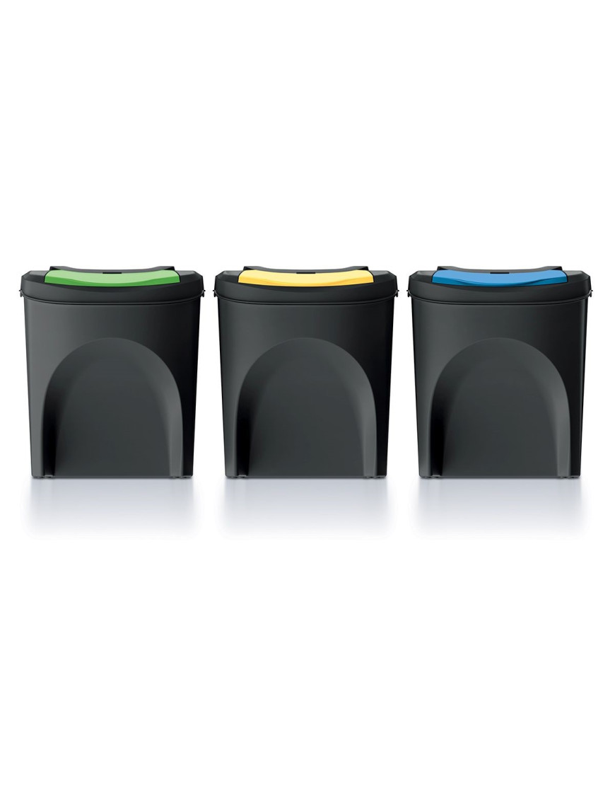 Súprava 3 odpadkových košov. Objem 3 x 25 litrov. Zostavenie jednotlivých košov do radov alebo na seba. Rôzne sfarbené veká na rozlíšenie košov. Materiál plast.