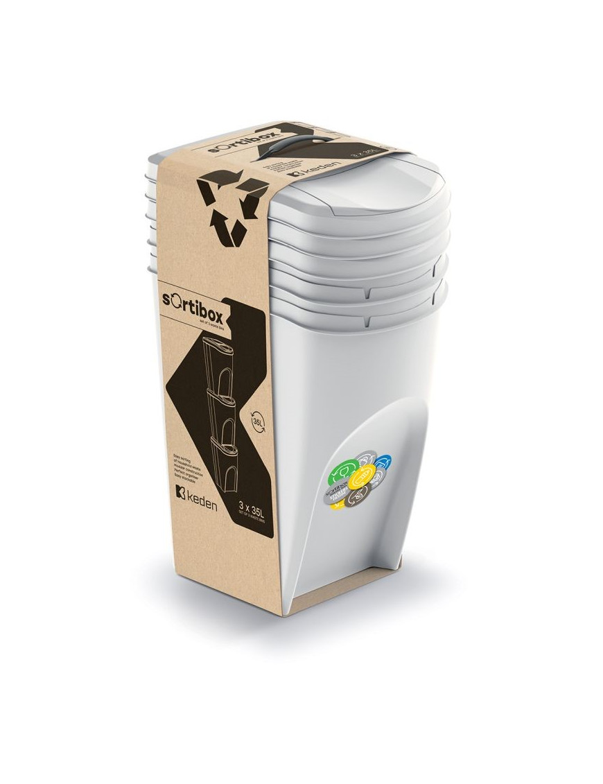 Súprava 3 odpadkových košov Sortibox. Objem 3 x 35 litrov. Umožňujú zostaviť jednotlivé koše do radov alebo stĺpcov. Farebné samolepky na rozlíšenie košov. Materiál odolný plast.