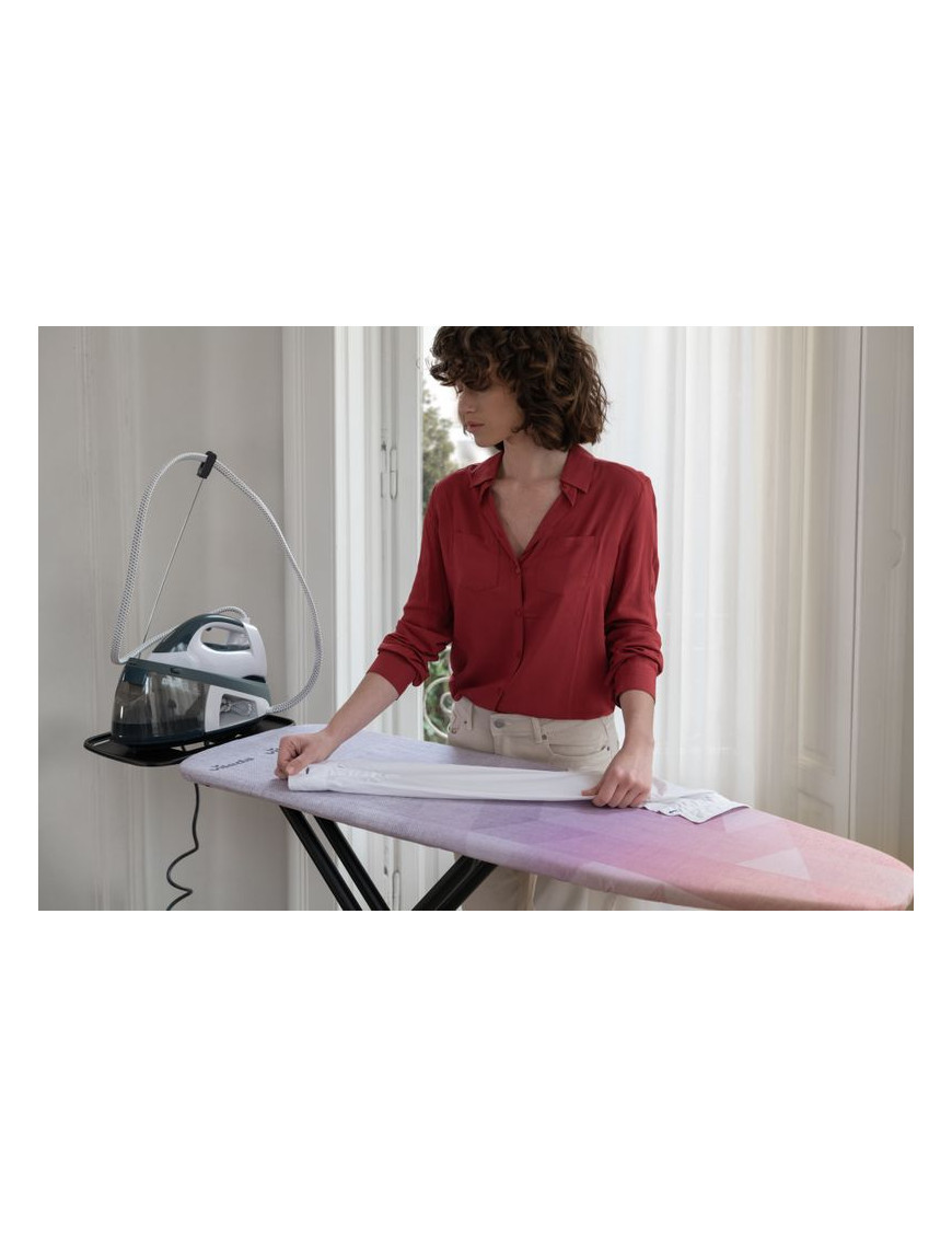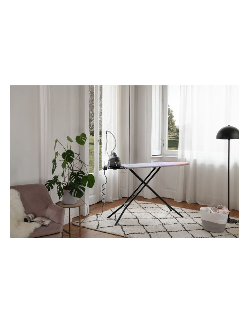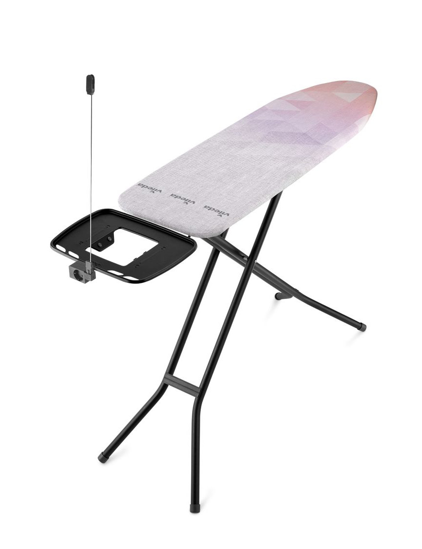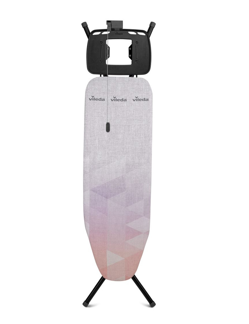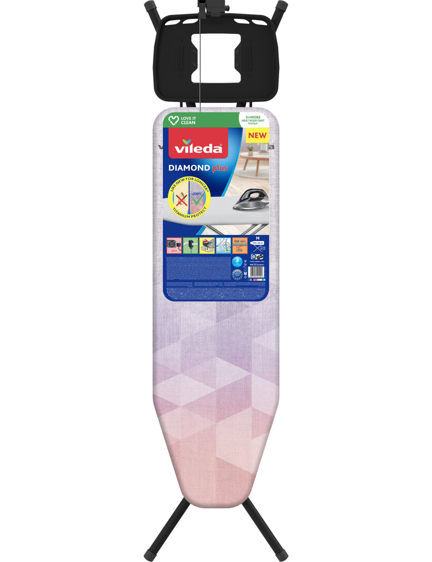Veľká kovová plocha (so zásuvkou a držiakom na šnúru) je vhodná pre žehličky s parným generátorom a parné stanice. je stabilná a bezpečná na odkladanie vďaka mimoriadne silným 28 mm okrúhlym nohám. Bez ohľadu na to, aký typ žehličky používate, žehliaca doska Vileda Diamond M vám padne ako uliata.