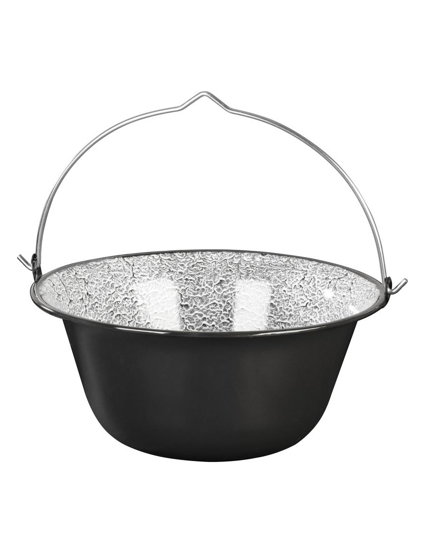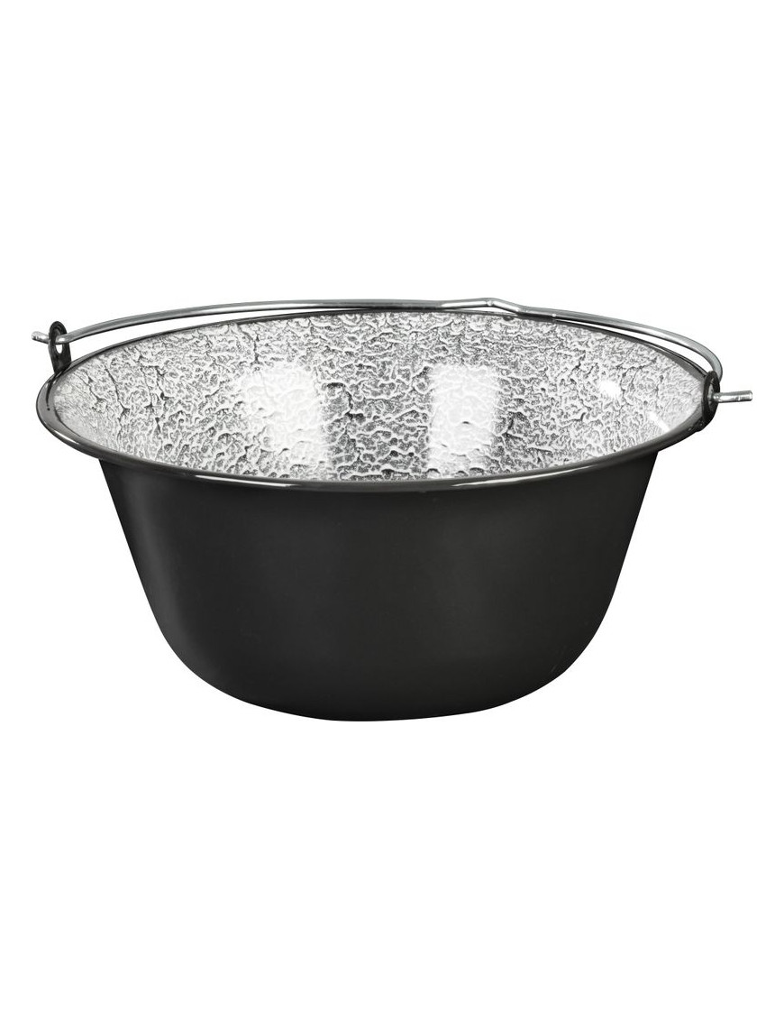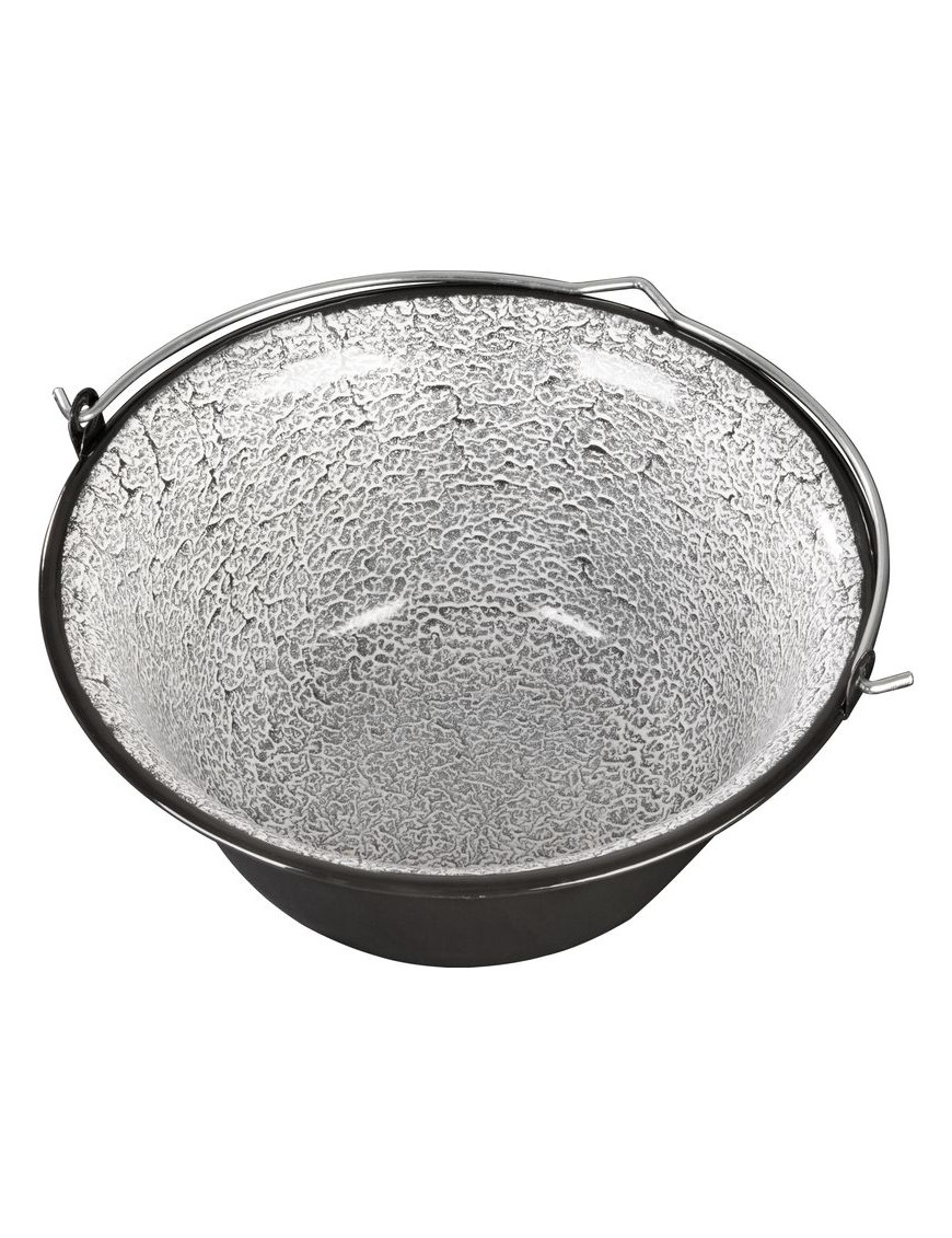 Kotlík je vyrobený z kvalitného oceľového plechu so smaltovanou povrchovou úpravou, ktorá je odolná voči vysokým teplotám, korózii aj opotrebeniu. Čierny dizajn pôsobí elegantne a je ľahko čistiteľný. Vďaka širokému hornému okraju a pevnému závesnému uchu sa hodí na zavesenie nad otvorený oheň, napr. na trojnožku alebo rošt.
