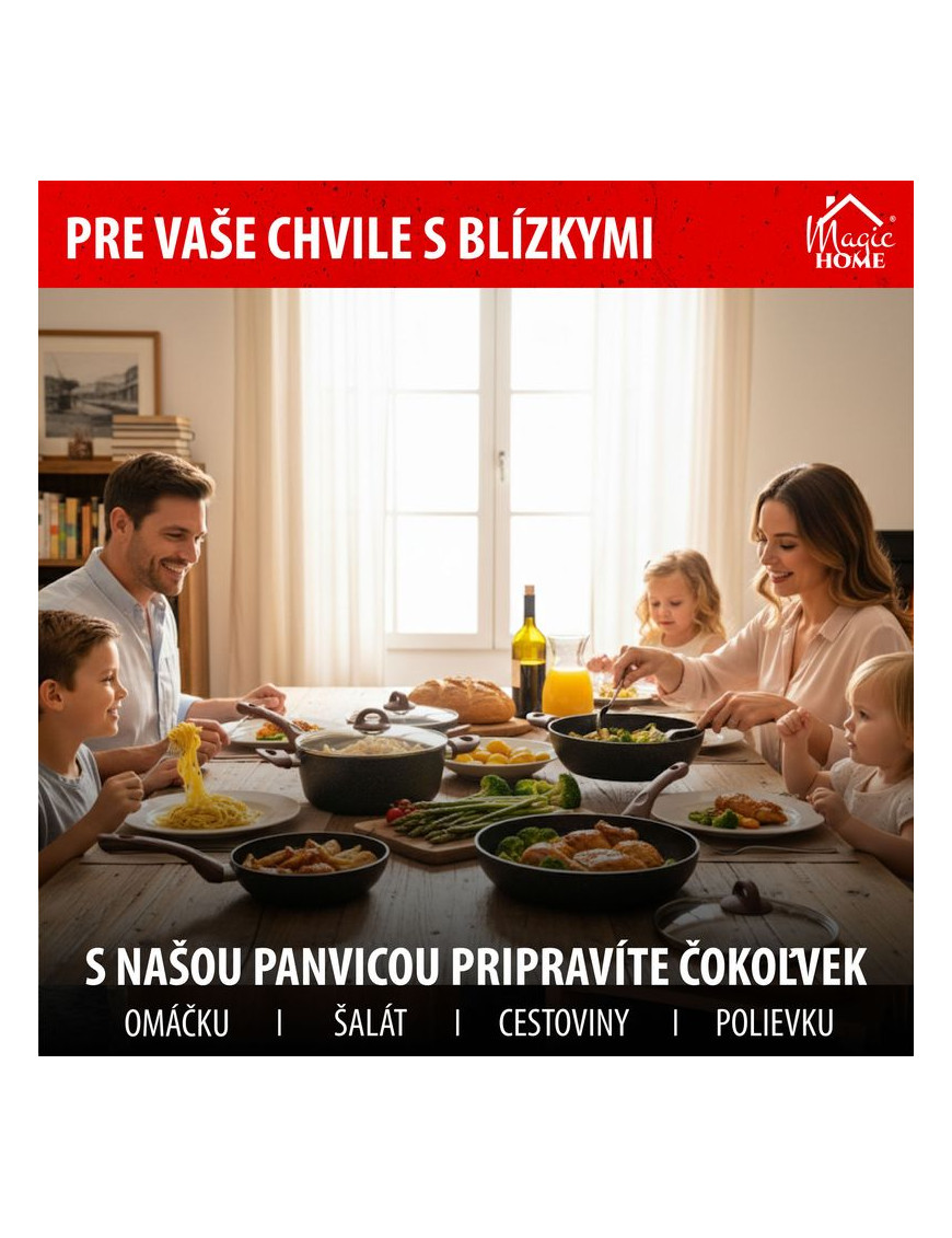 Ak si potrpíte na kvalitné kuchynské riady, táto panvica je pre Vás ako stvorená. Panvica MagicHome Black Marble Line je vyrobená zo zliatiny hliníka s nepriľnavým povrchom a 3-vrstvovým mramorovým náterom. Má 3 mm indukčné dno, ktoré šetrí energiu. Rukoväť obsahuje drevený náter s ochranou proti plameňu. Panvica je vhodná na všetky typy sporákov : indukcia, elektrika, plyn, sklokeramika a halogén a je tiež vhodná do umývačky riadu. Nevhodná do rúry. Je šetrná k životnému prostrediu, neobsahuje PFOA, PFOS, VOC, PB ani CD. Priemer: 24 cm.