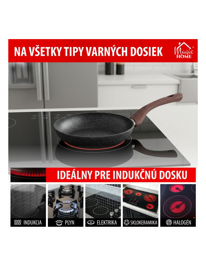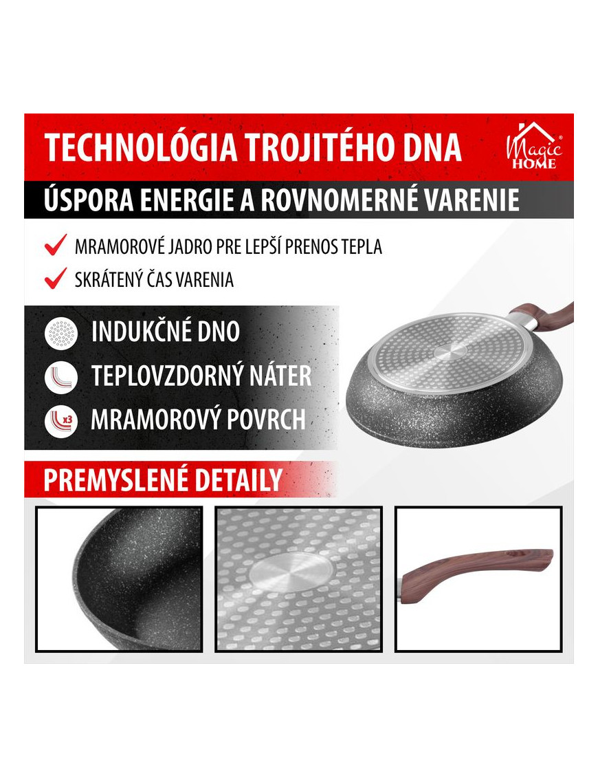 Ak si potrpíte na kvalitné kuchynské riady, táto panvica je pre Vás ako stvorená. Panvica MagicHome Black Marble Line je vyrobená zo zliatiny hliníka s nepriľnavým povrchom a 3-vrstvovým mramorovým náterom. Má 3 mm indukčné dno, ktoré šetrí energiu. Rukoväť obsahuje drevený náter s ochranou proti plameňu. Panvica je vhodná na všetky typy sporákov : indukcia, elektrika, plyn, sklokeramika a halogén a je tiež vhodná do umývačky riadu. Nevhodná do rúry. Je šetrná k životnému prostrediu, neobsahuje PFOA, PFOS, VOC, PB ani CD. Priemer: 28 cm.