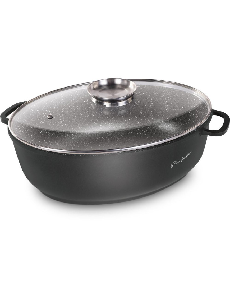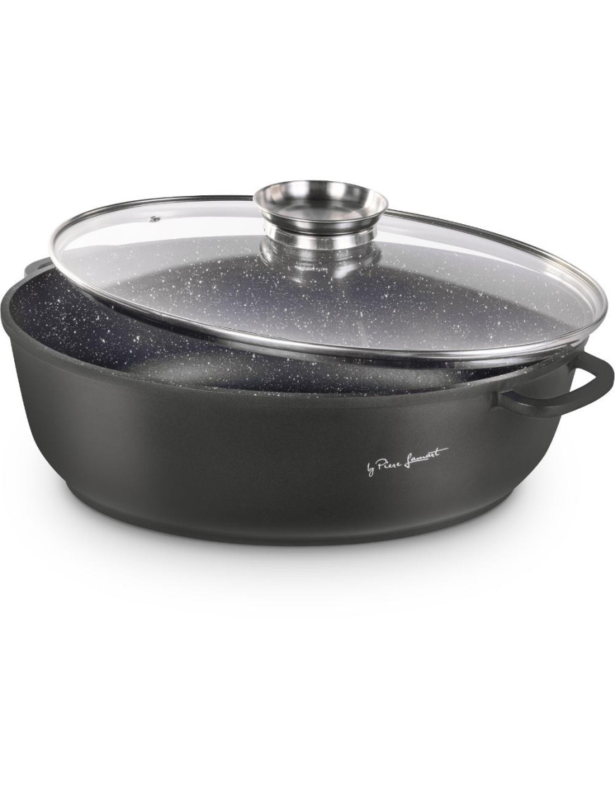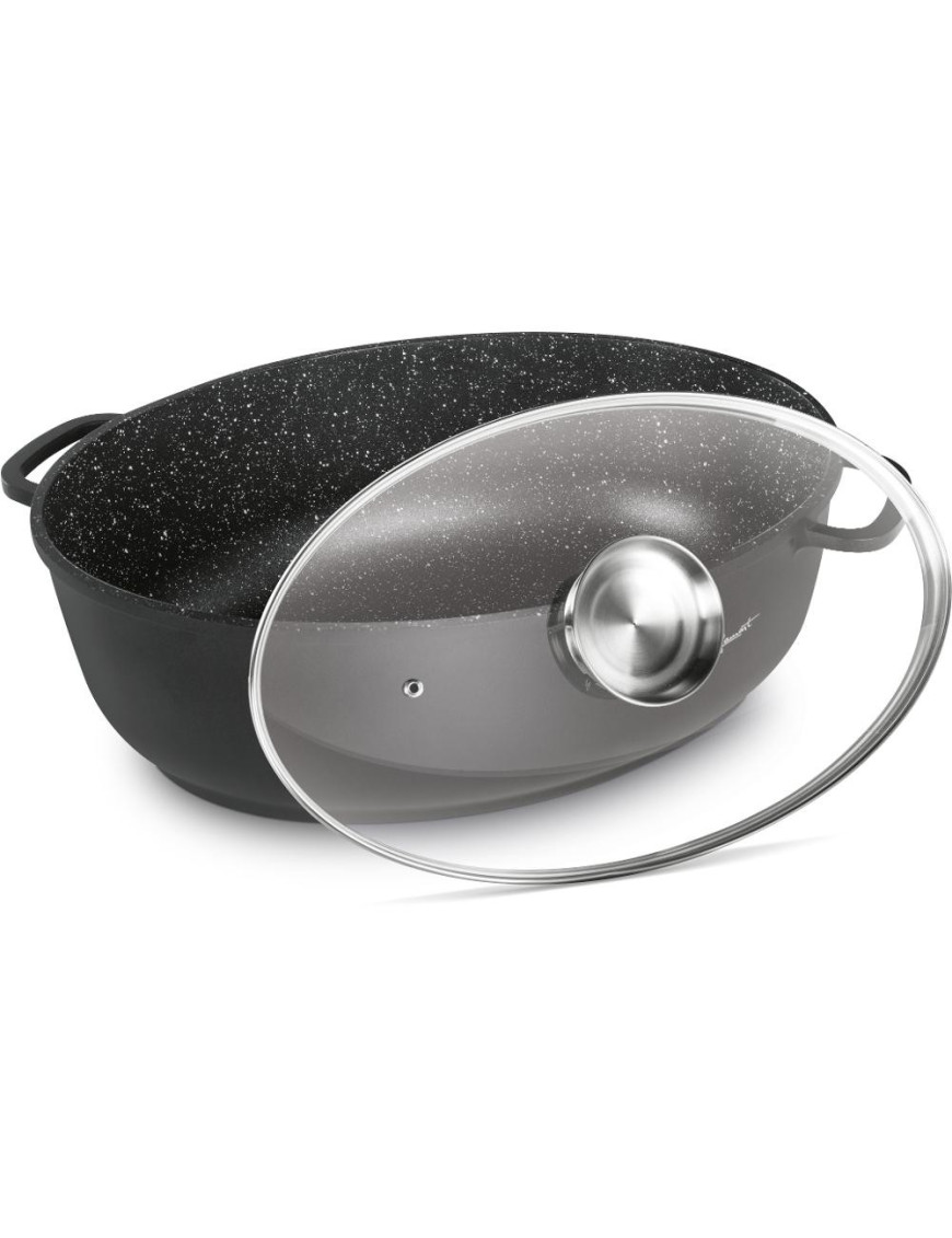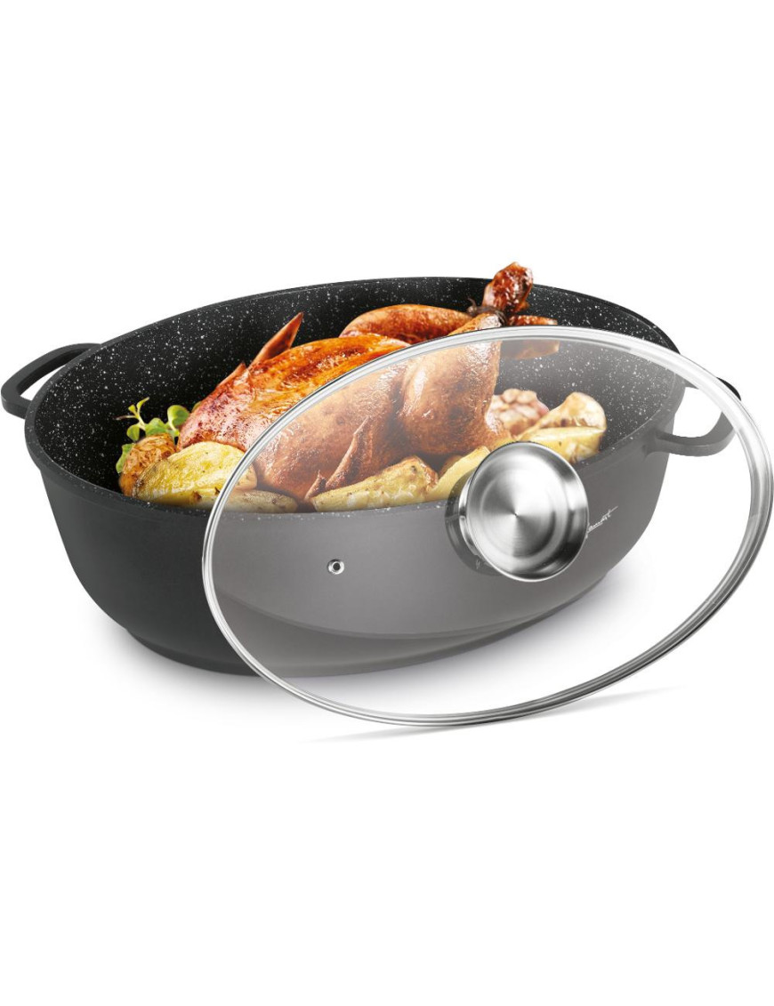 Vysokokvalitný liaty hliníkový pekáč so skleneným vekom s vnútorným povrchom odolným proti pripáleniu, vybavený hrubým dnom. Pokrievka z odolného varného skla s otvorom na paru s arómou pre dokonalú kontrolu pečenia.