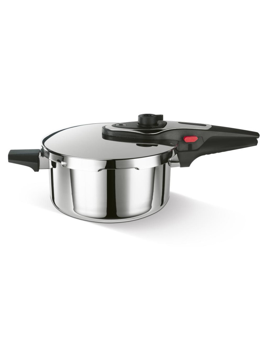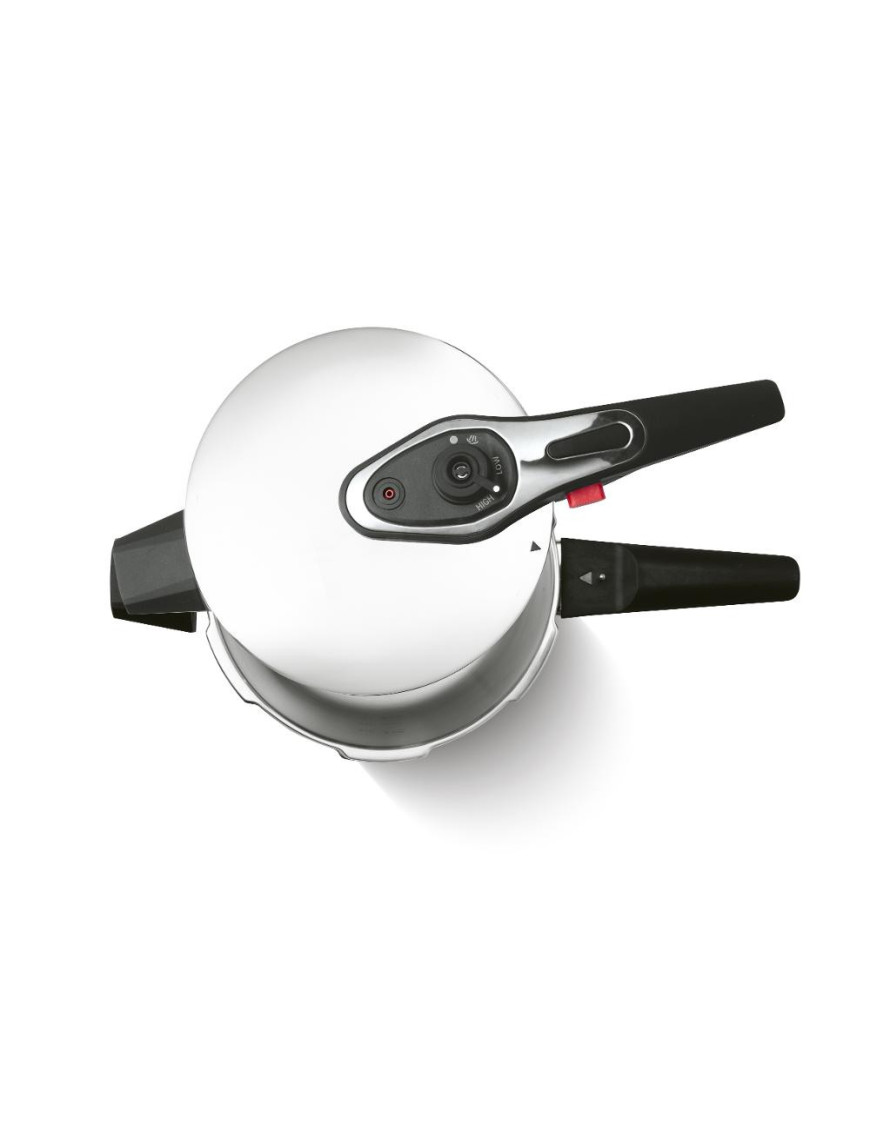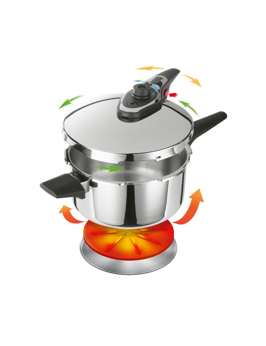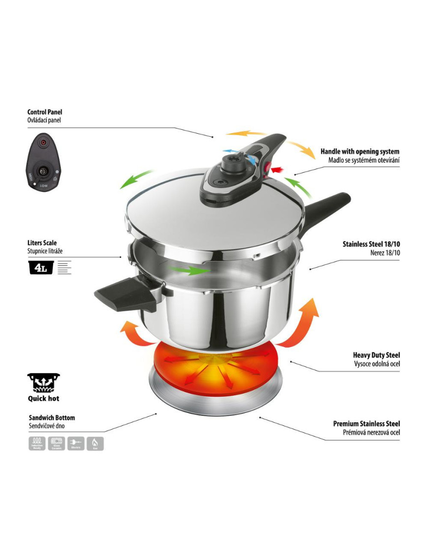 Štyri poistky, indikátor tlaku a dvojitý bezpečnostný ventil zaisťujú maximálnu bezpečnosť pri varení. Sendvičové dno umožňuje rovnomerné rozloženie tepla, čo skracuje dobu varenia a šetrí energiu. Moderný dizajn hrnca dodá vašej kuchyni elegantný vzhľad.