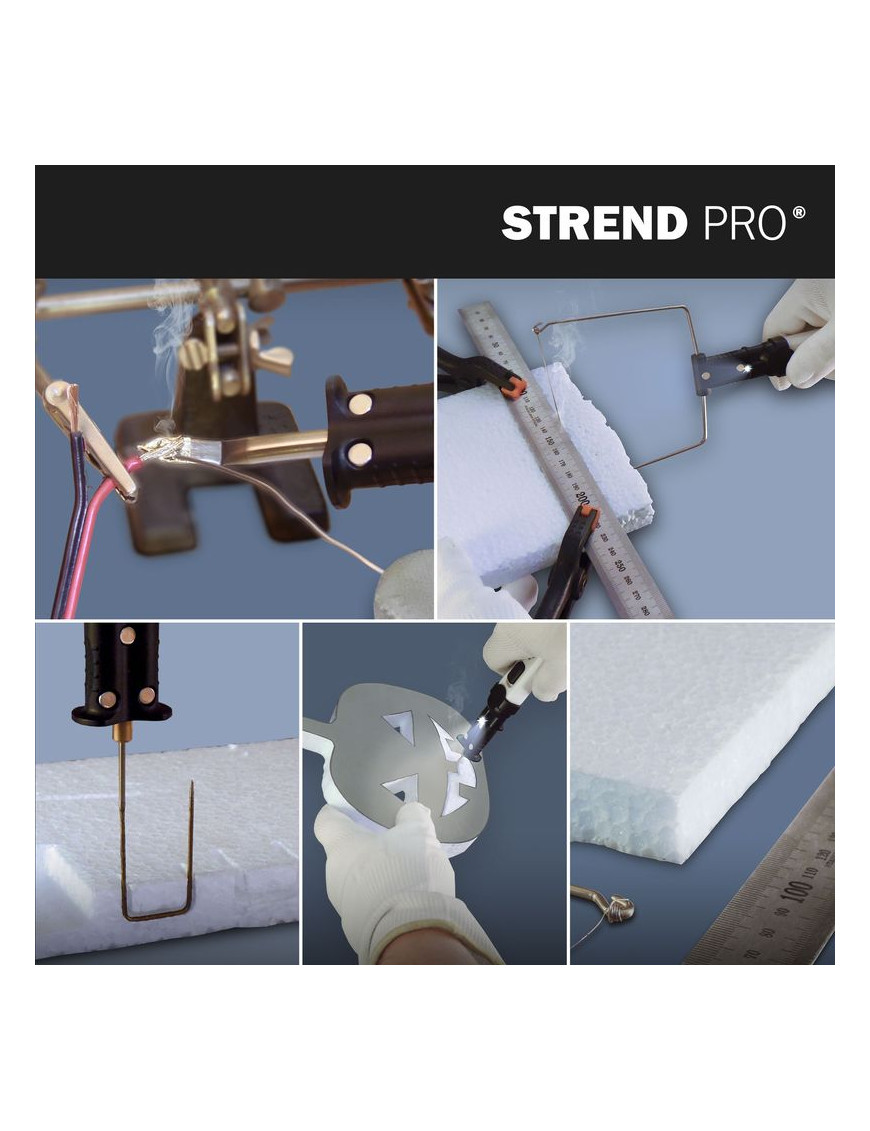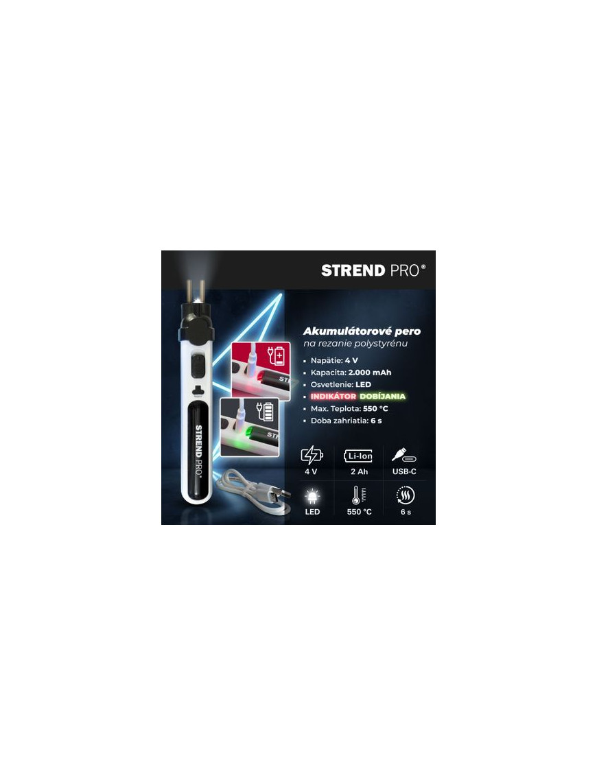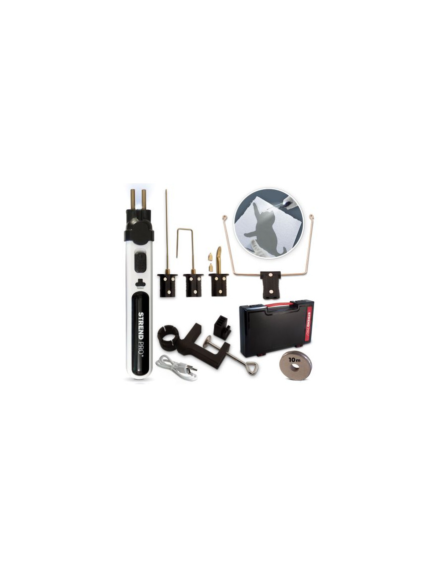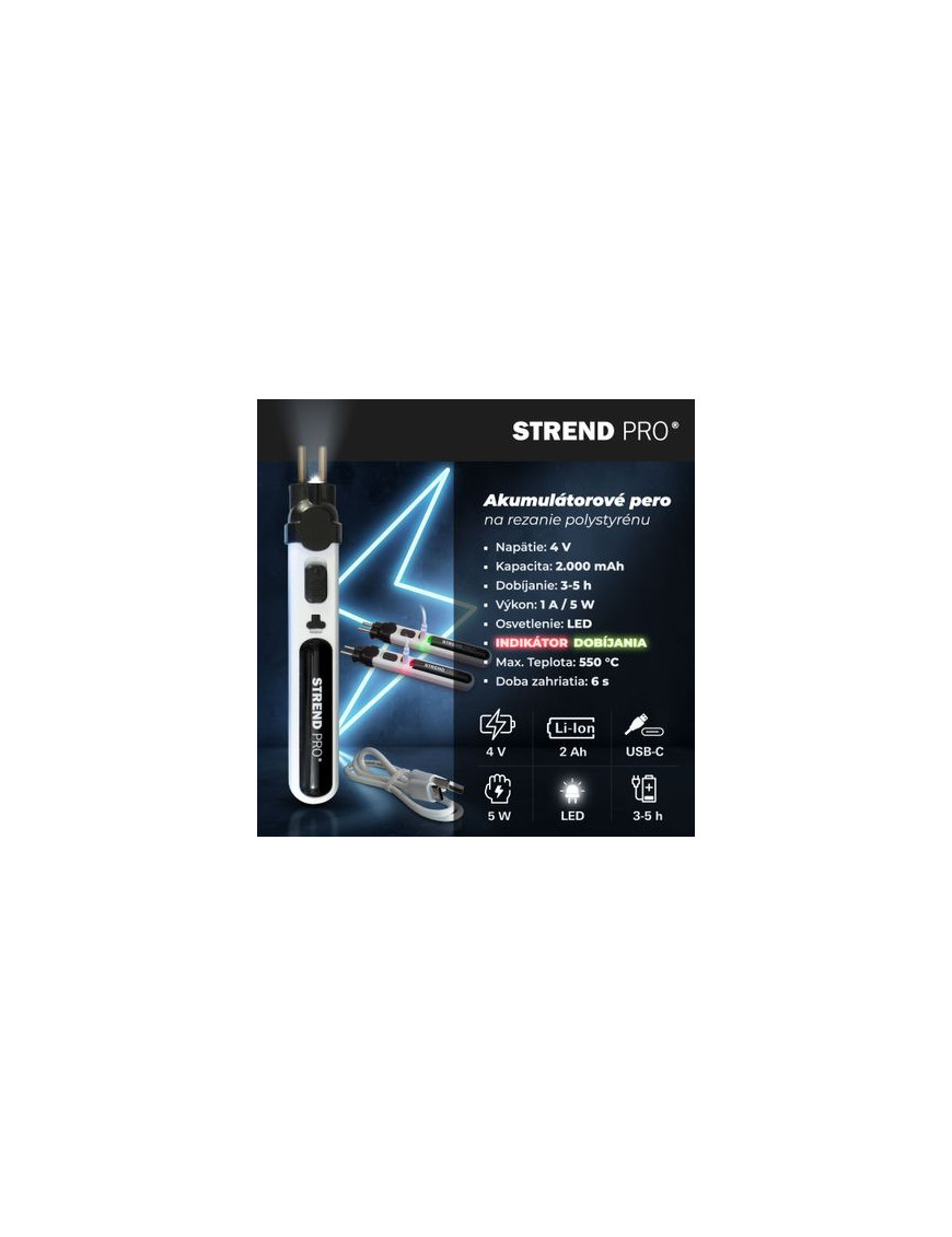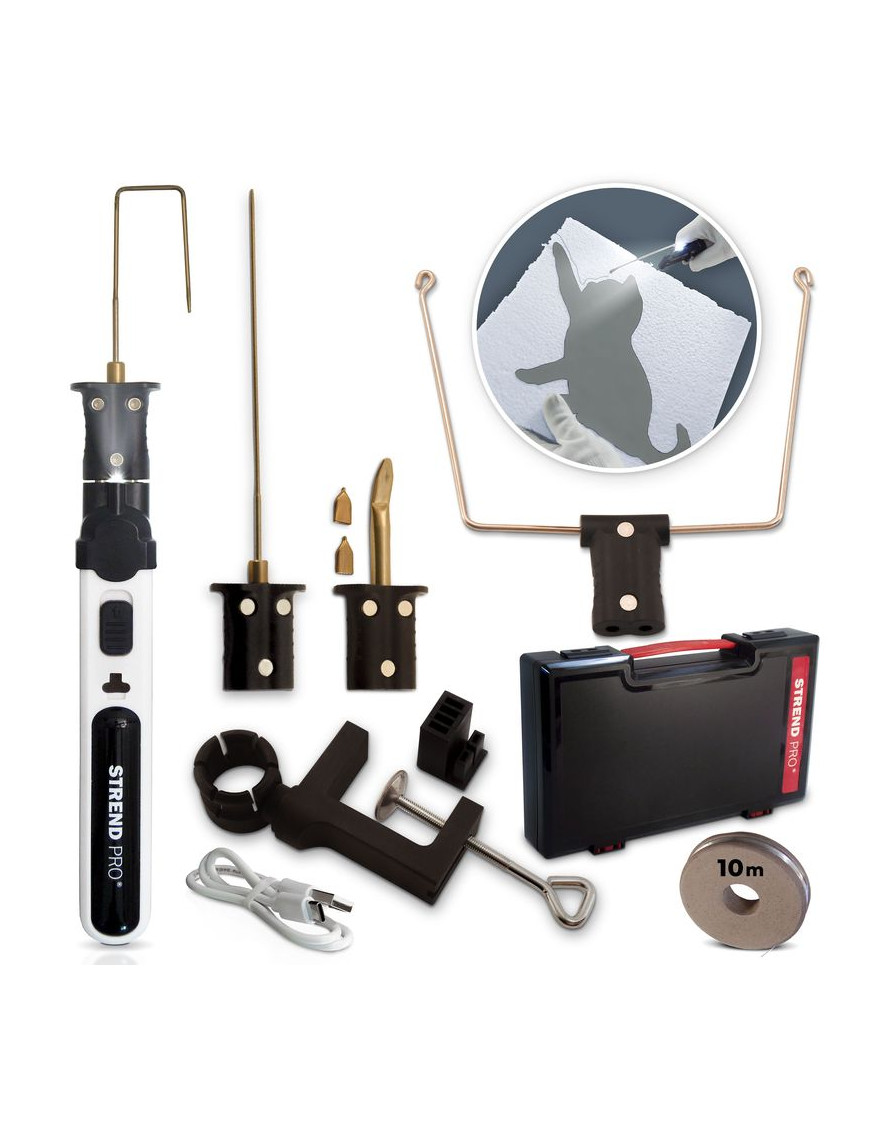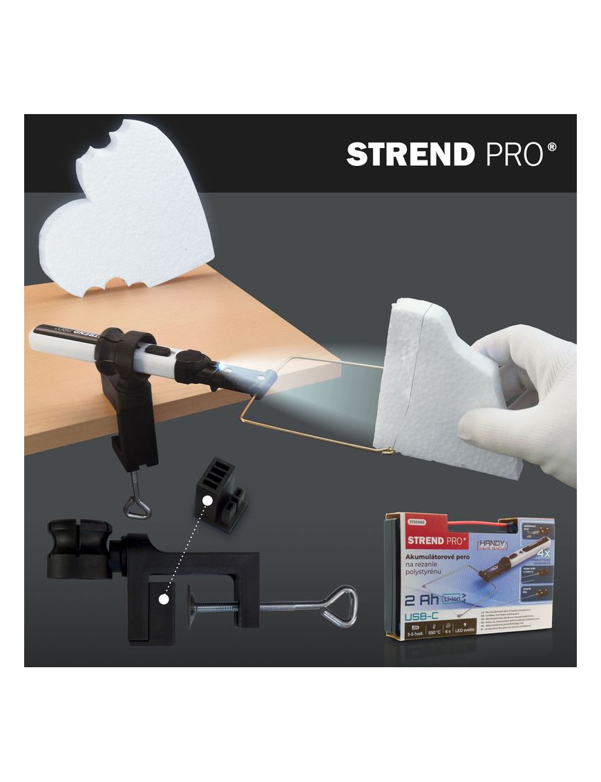 Akumulátorové pero Strend Pro je určené na jemné a presné tvarové vyrezávanie pomocou rezacieho drôtu, na vykonávanie skracovacích rezov a vyrezávanie väčších predmetov nožom z polystyrénu. Sada obsahuje 4 rôzne rezacie nadstavce pre rôzne aplikácie. Vidlica s rezacím drôtom je určená na jemné a presné vyrezávanie, krájanie a tvarovanie materiálu. Rezací drôt v tvare písmena U umožňuje drážkovanie do materiálu pre osadenie káblov. Pomocou rezacej dierovacej ihly je možné vyrezávať rôzne tvary. S použitím špeciálneho hrotu na spájkovanie je akumulátorové pero na rezanie polystyrénu určené aj na vytváranie spájaných spojov pomocou cínovej spájky. Balenie obsahuje akumuátorové pero, vidlicu s rezacím drôtom (10 m x 38 mm), rezací nôž v tvare U, rezaciu ihlu, svorku na upevnenie k pracovnému stolu, nadstavec so spájkovacím hrotom a USB-C nabíjacím káblom.