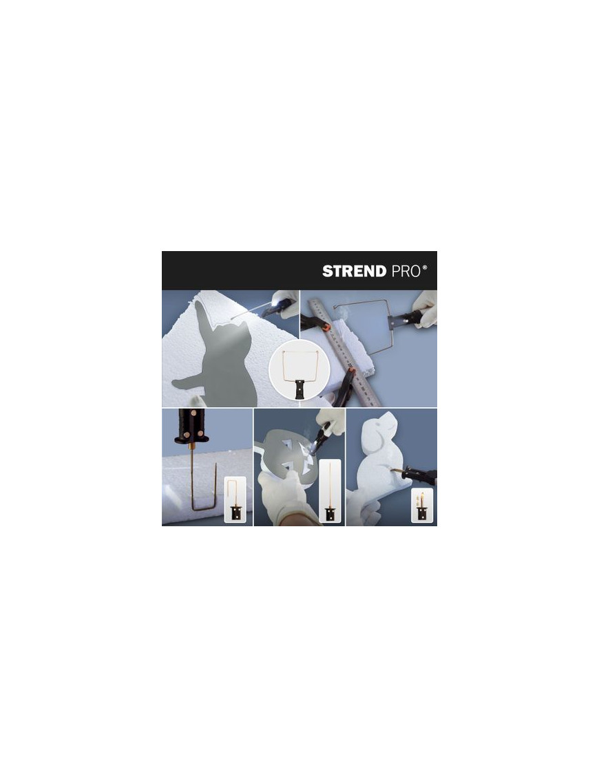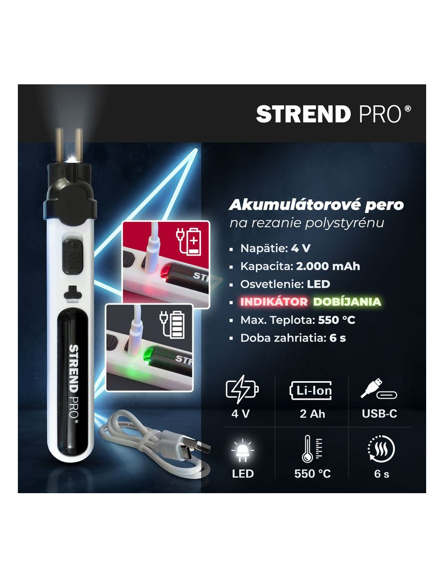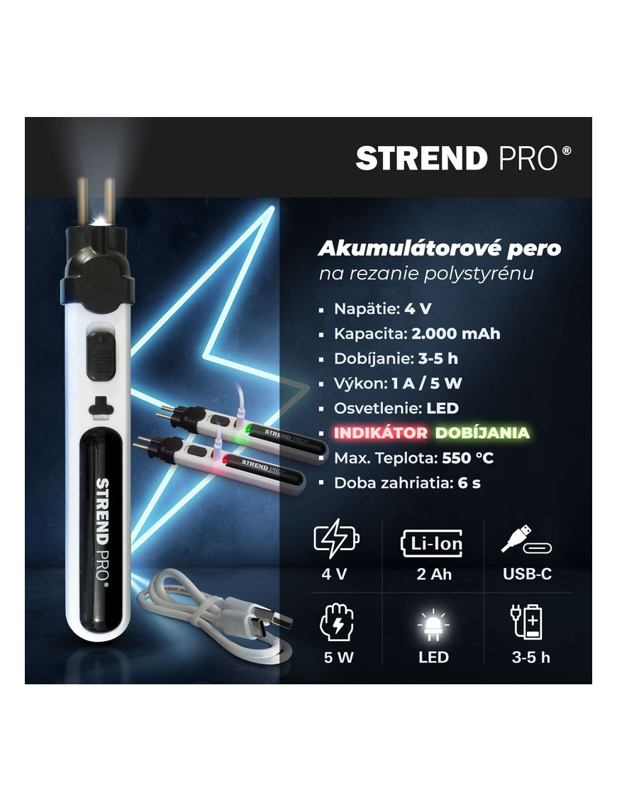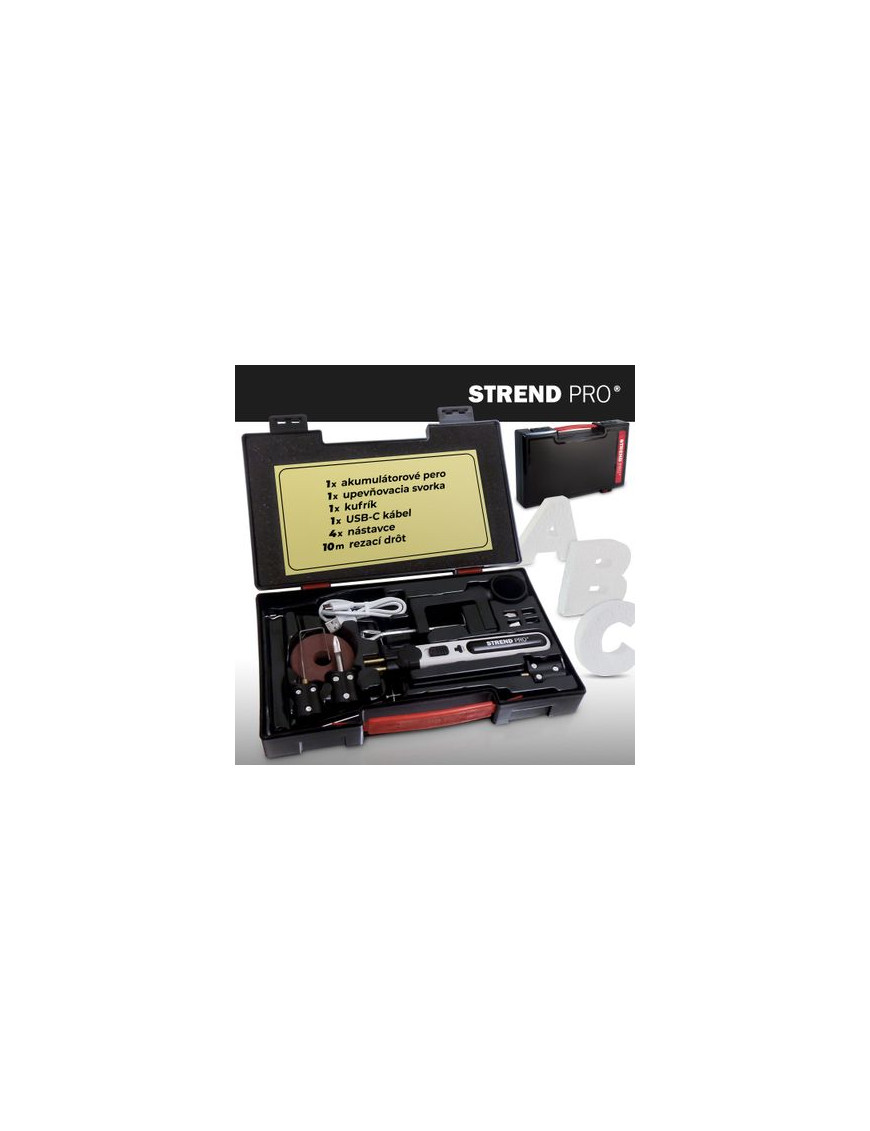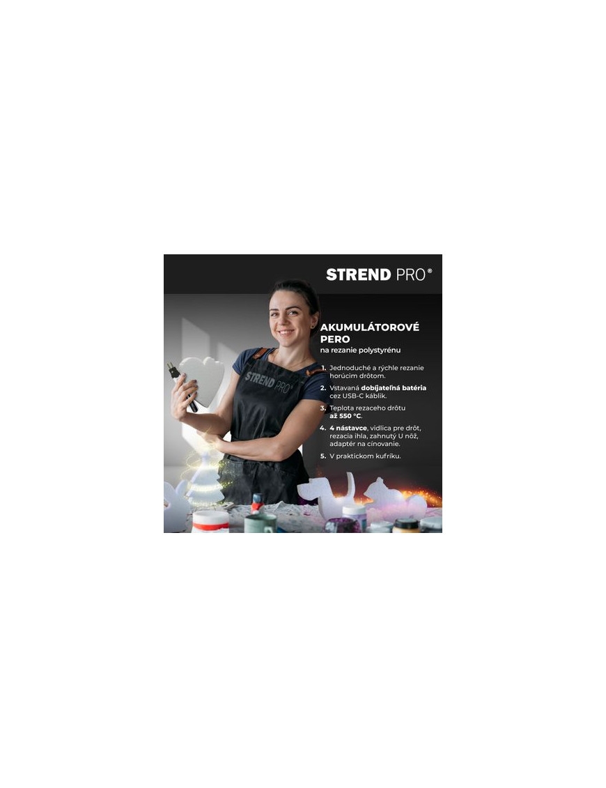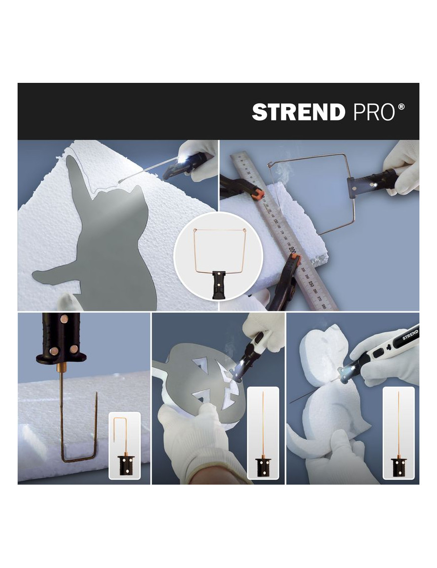 Akumulátorové pero Strend Pro je určené na jemné a presné tvarové vyrezávanie pomocou rezacieho drôtu, na vykonávanie skracovacích rezov a vyrezávanie väčších predmetov nožom z polystyrénu. Sada obsahuje 4 rôzne rezacie nadstavce pre rôzne aplikácie. Vidlica s rezacím drôtom je určená na jemné a presné vyrezávanie, krájanie a tvarovanie materiálu. Rezací drôt v tvare písmena U umožňuje drážkovanie do materiálu pre osadenie káblov. Pomocou rezacej dierovacej ihly je možné vyrezávať rôzne tvary. S použitím špeciálneho hrotu na spájkovanie je akumulátorové pero na rezanie polystyrénu určené aj na vytváranie spájaných spojov pomocou cínovej spájky. Balenie obsahuje akumuátorové pero, vidlicu s rezacím drôtom (10 m x 38 mm), rezací nôž v tvare U, rezaciu ihlu, svorku na upevnenie k pracovnému stolu, nadstavec so spájkovacím hrotom a USB-C nabíjacím káblom.