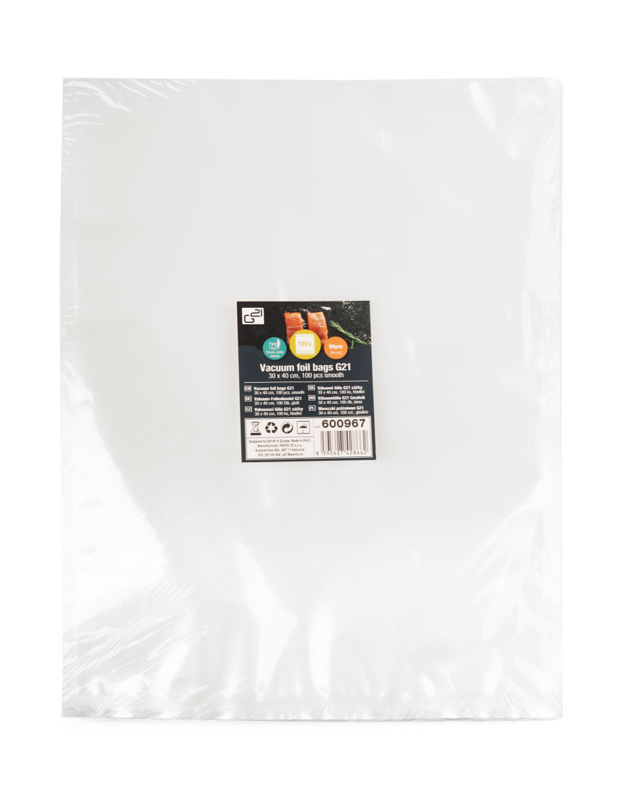 Hladké vákuovacie vrecká G21 s rozmermi 30 x 40 cm sú vďaka svojej vysokej pevnosti a kvalitnému prevedeniu vhodné nielen na predĺženie trvanlivosti potravín vákuovaním a ich uchovávanie v chladničke alebo v mrazničke, ale využijete ich aj na vákuovanie surovín pre sous-vide varenie.