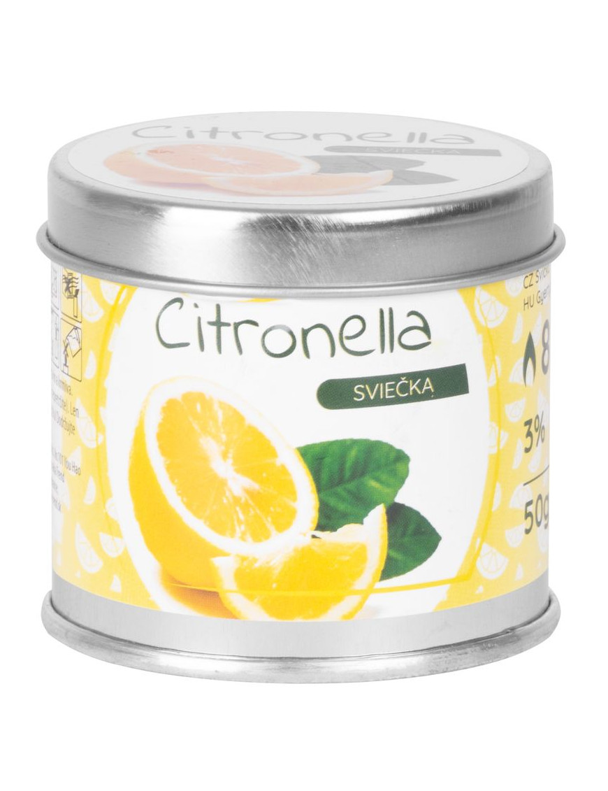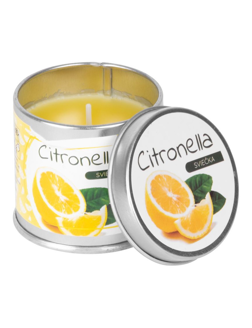 Sviečka Citronella v plechovke prevonia Váš domov sviežou citrusovou vôňou. Doba horenia : 8 hodín. Rozmery : 55x55 mm.