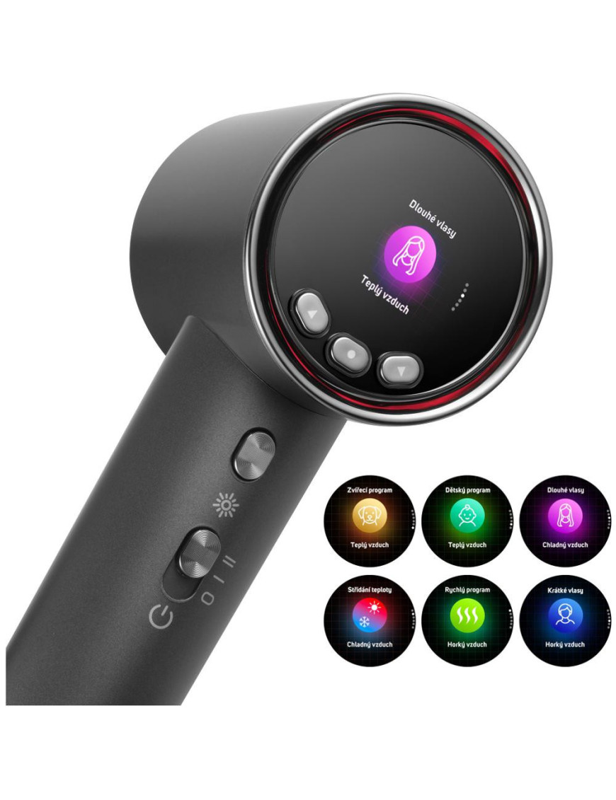 5 šikovných režimov: Rýchly program, Striedanie teploty, Dlhé vlasy, Krátke vlasy, Detský program, Zvierací program