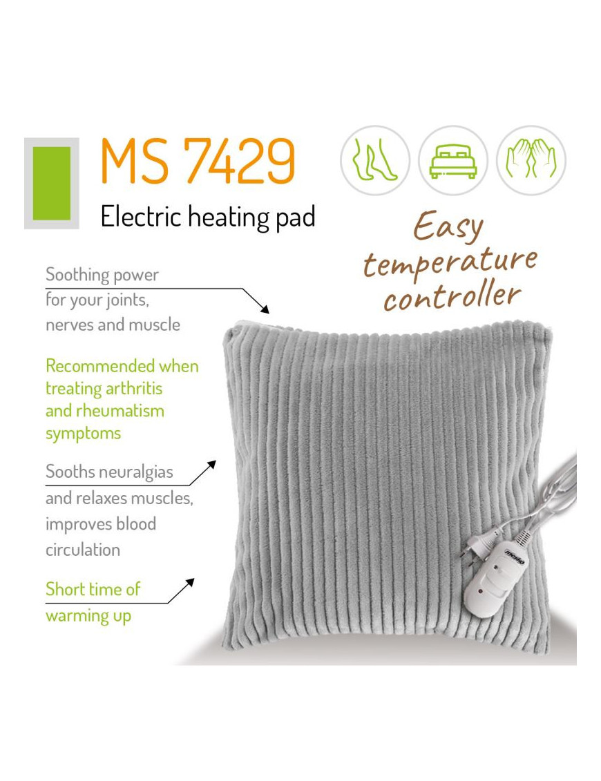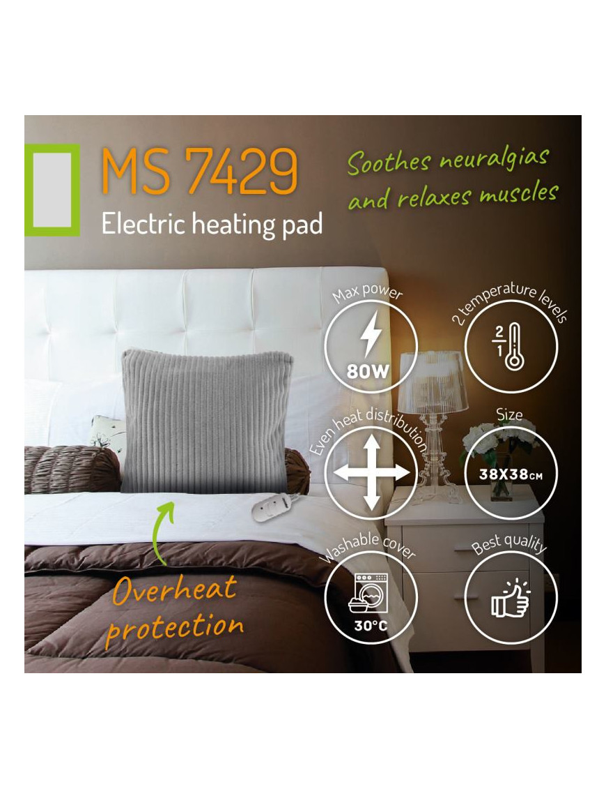 Elektrická vyhrievacia podložka Mesko MS 7429 (80 W) prináša rýchlu úľavu a teplo. Je ideálna pri zmierňovaní príznakov artritídy, reumatizmu a neuralgie. Uvoľňuje svaly a zlepšuje krvný obeh. Má 2 stupne teploty, ochranu proti prehriatiu a diaľkové ovládanie na kábli. Odnímateľný poťah z mäkkého flísu s otvormi na ruky a nohy je možné prať v práčke. Rozmer podložky je 38x38 cm. Praktický pomocník pre vaše zdravie a pohodlie v elegantnej sivej farbe.