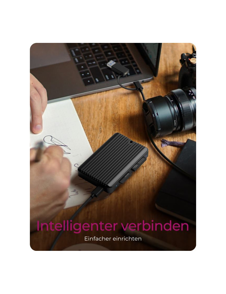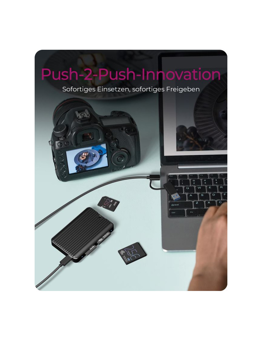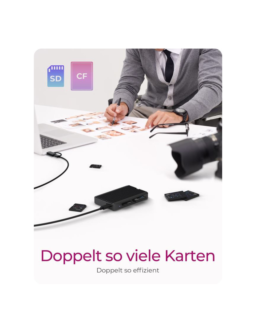 Čítačka kariet IB-CR504-C31 od značky ICY BOX je moderné a kompaktne navrhnuté zariadenie, ktoré podporuje CFexpress a SD 4.0 karty. Je vybavená pripojením USB 3.2, čo umožňuje rýchlosti prenosu dát až do 1 GB/s pre CFexpress a 300 MB/s pre SD UHS-II karty. Čítačka ponúka dual USB-C a USB-A porty, čo ju robí kompatibilnou s rôznymi systémami, vrátane Windows a macOS. Je ideálna pre profesionálnych fotografov a videografov, ktorí potrebujú rýchly a efektívny prístup k svojim súborom