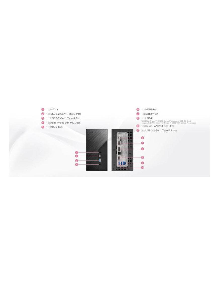 Mini Počítač - (nutné dokúpiť CPU, HDD, RAM, OS) - DeskMini X600/USB4 Series je kompaktný 1.92L Mini PC, ktorý podporuje procesory AMD Socket AM5 Ryzen 9000/8000/7000 s maximálnym príjmom 65W. Pc ponúka duálne DDR5 pamäte s frekvenciou 6400+(OC)MHz a maximálnou kapacitou 128GB. Disponuje tromi video výstupmi: 1 x USB4, 1 x HDMI a 1 x DisplayPort. Umožňuje pripojiť štyri úložné zariadenia vrátane dvoch 2.5" HDD/SSD a dvoch M.2 slotov (PCIe Gen5 a Gen4). Obsahuje tiež bohatú ponuku USB portov: 1
