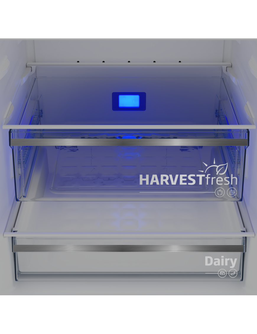 Svetelný režim priehradky HarvestFresh™ kopíruje striedanie slnečného svetla a tmy počas celého dňa. To udržuje prirodzené procesy v ovocí a zelenine, takže sa uchová viac vitamínov aj chuti, ako keby boli zatvorené len v tme. Uskladnené ovocie a zelenina sa neskazia tak rýchlo, ich čerstvosť vydrží dlhšie a to uľahčí časté nakupovanie.