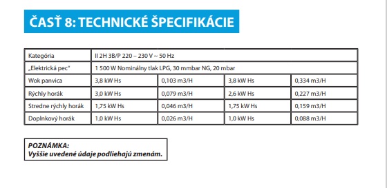 | Varné zóny: | Maximálny výkon horákov 7,5 kW Ľavá zadná 1750 W Pravá zadná 1750 W Ľavá predná 3000 W Pravá predná 1000 W |